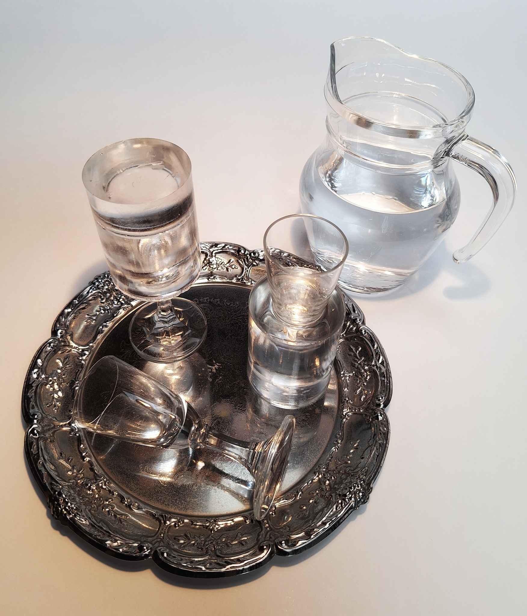 Still Life (For Use) presents three identical glasses on a fake silver plate, accompanied by a simple water pitcher. The first glass lies untouched, fully ready for use. The second has its upper half cast in resin, rendering it entirely unusable. The third has its lower half cast: technically functional but awkward to handle. By partially immobilizing these objects, the work changes their ontological status. The untouched glass remains ready-to-hand (Zuhandenheit), a tool whose being is absorbed in use. The resin-coated glasses shift toward present-at-hand (Vorhandenheit), their materiality and being revealed precisely through obstruction. The contrast between ready, hindered, and awkwardly functional exposes the tension between potential and actual use, and how estrangement transforms ordinary objects into contemplative presences. The simple water pitcher points to intended use, emphasizing the gap between function and being, and inviting reflection on desire, habit, and our assumptions about the everyday.