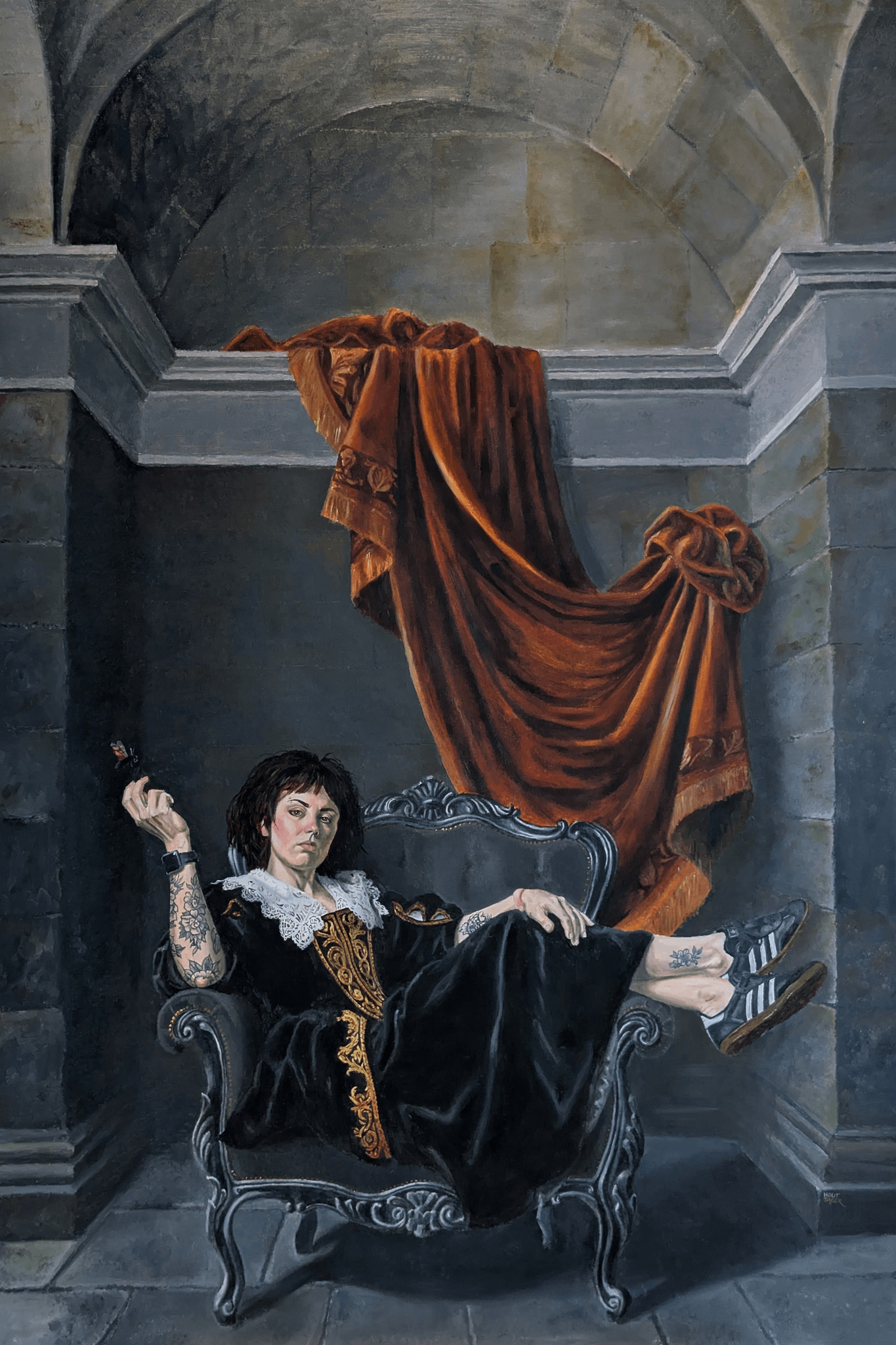 Zoals Vesper in dit doek de 17e-eeuwse nis opeist met haar Adidas en haar tattoos, zo claim jij je plek in de markt. Mijn portretten in de serie Baroque&Roll zijn voor de founders die begrijpen dat ware macht schuilt in de nonchalance van succes.