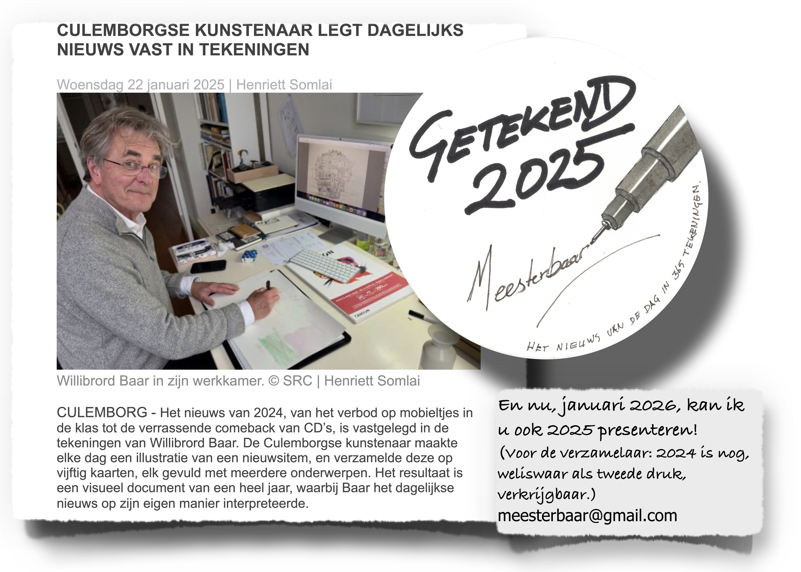 Elke dag wordt een tekeningetje gemaakt naar aanleiding van een gebeurtenis in het nieuws. In een jaar tijd levert dit 365/366 tekeningetjes op. Deze worden verzameld om zo'n 55 A5 kaarten en begin januari in een verzamelbox gepresenteerd