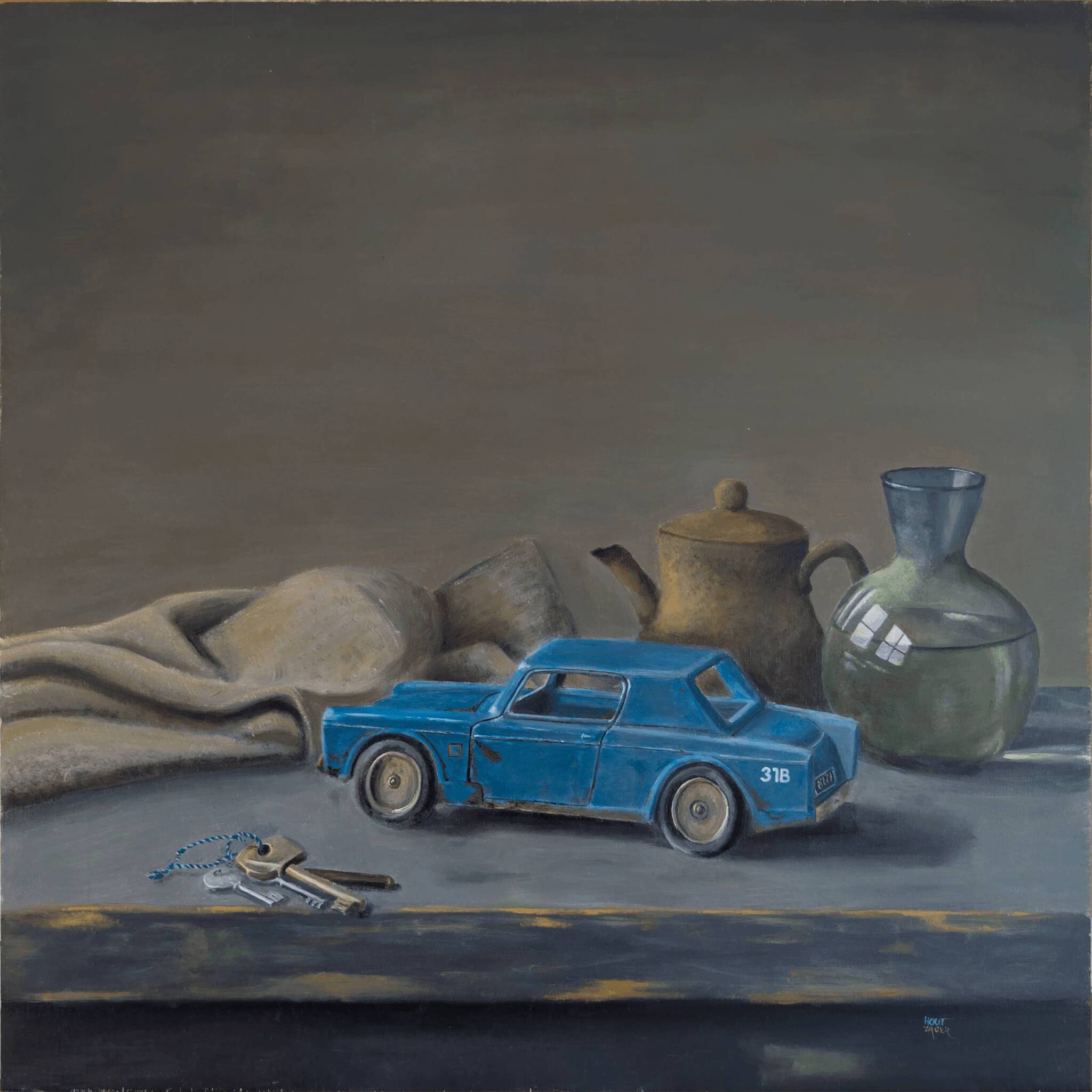 De serie Nostalgia bestaat uit 4 stillevens die refereren aan de verstilling die eind jaren 70 veel normaler was dan nu. Elk werk doet denken aan het kopje thee in de middag, na school. Eenvoud, degelijk materiaal. In elk van de vier stillevens is 1 stuk speelgoed de hoofdrolspeler. Een hoofdrolspeler in een heldere blauwe kleur in een setting van aardse tinten. In deel 1 staat een helder blauwe Dinky Toy centraal. Het legendarische Britse merk Dinky Toy staat voor onverwoestbaarheid, zodat je uren kon spelen met je auto’s, op het kleed en in het zand. In je fantasie was jij de coureur die deze blauwe bolide in de bocht kon houden. En dan, na uren spelen zonder gestoord te worden door een “ping” in je broekzak, riep je moeder je binnen voor thee en een koekje. Het leven was niet beter maar wel simpeler en kleiner. Daarmee was de ruimte voor je fantasie een stuk groter. Dinky Toy heeft daar aan bijgedragen, in elk geval in mijn jeugd. Precies dat wil ik weergeven met deze vier werken. Nog steeds heb ik een bak met autootjes van vroeger en de paar Dinky Toys daarin zijn me dierbaarder dan alle Matchboxes bij elkaar.