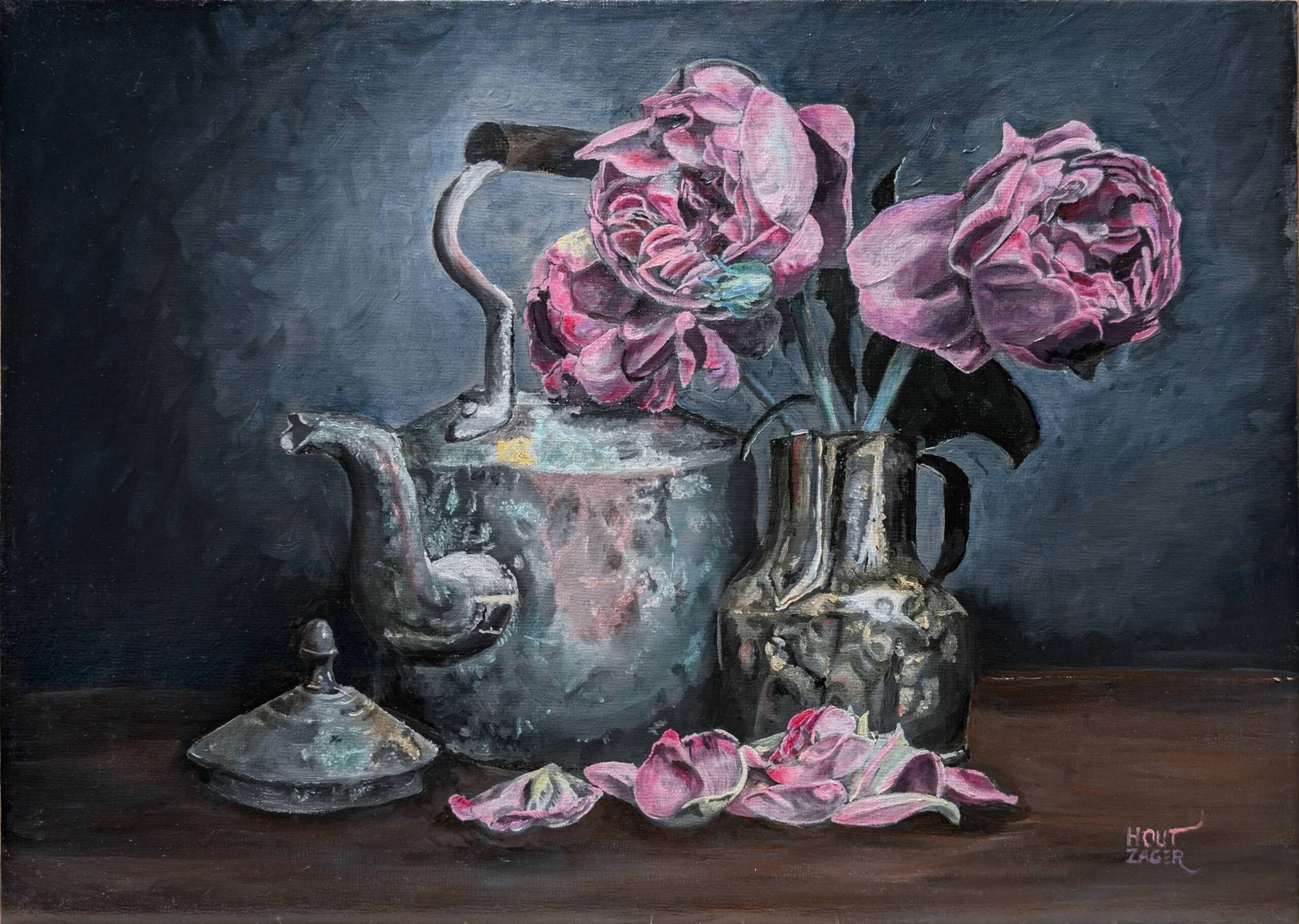 Ik hou van de ambiance op dit stilleven: donkere tonen waarin de roze pioenen leven brengen. Hoewel, leven? De eerste blaadjes vallen reeds. De ketel en de theepot zijn van een ander metaal en hebben een ander leven gehad. Allebei vol butsen maar je ziet dat de theepot vaker met liefde is gepoetst. De ketel daarentegen nam het doffer worden maar voor lief. Geverfd als grisaille/glacering. Dus eerst alles volledig in grijstinten, inclusief alle details, en later pas heel voorzichtig in meerdere lagen kleur aanbrengen, waardoorheen je de licht/donker werking van de onderlaag blijft zien. Deze techniek zorgt ervoor dat de kleuren dieper worden, en dynamischer dan wanneer je in een keer de kleur opzet. Dit is het eerste werk dat ik in grisaille en glacering heb uitgevoerd dus het begin van een ontdekkingsreis.