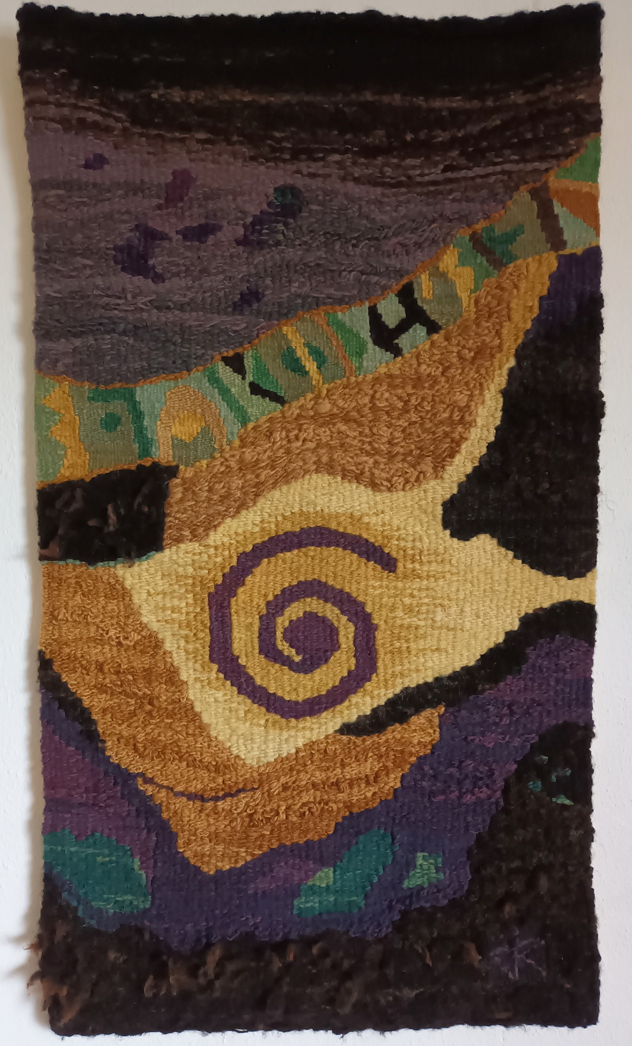 Mijn wandkleden worden gemaakt van schapenwol die ik zelf spin, waarna ik deze verf met plantaardige materialen , zoals indigo, meekrap en fustic. De techniek is inlegwerk op 2 schachten.