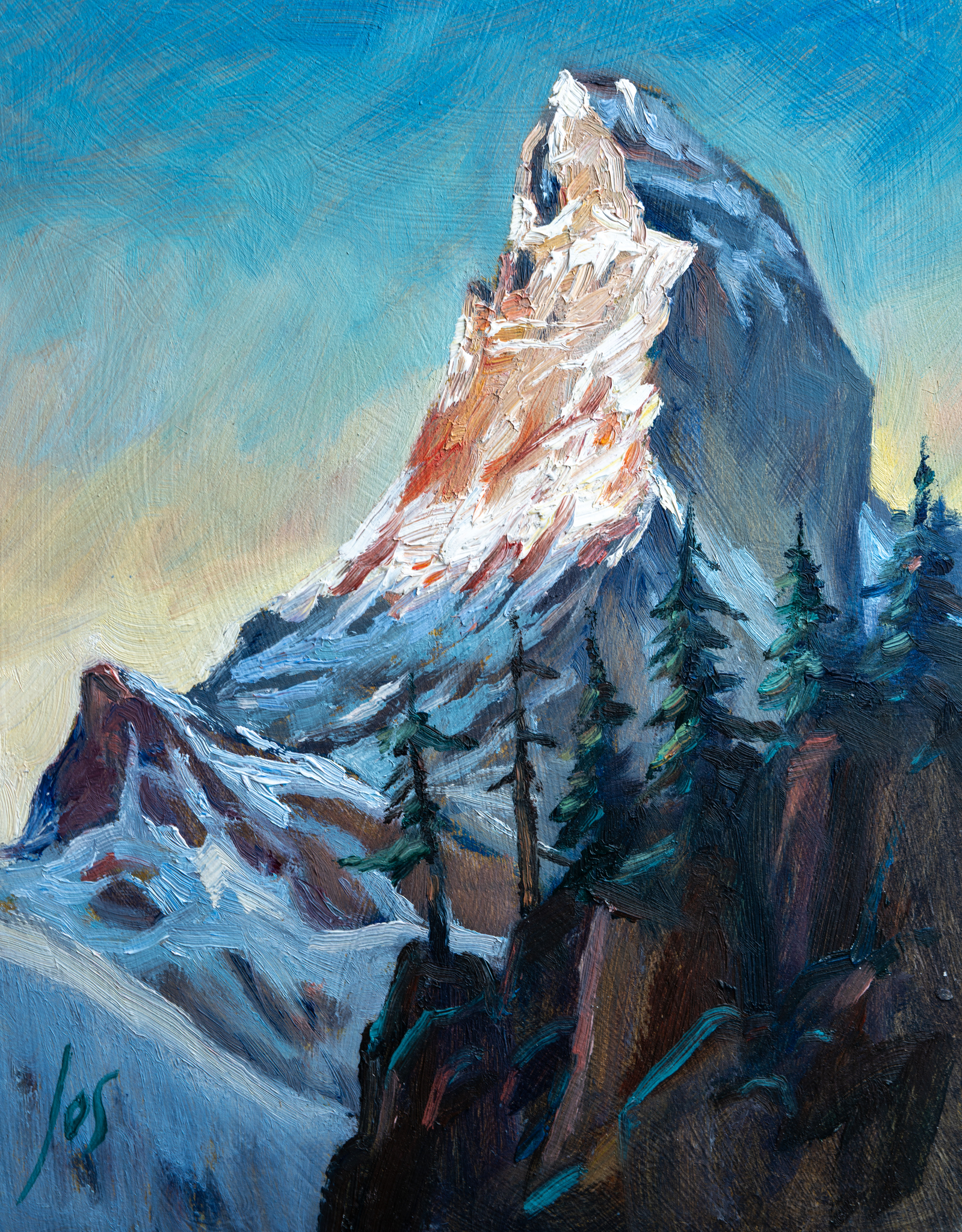 olieverf Matterhorn, dit is een van de kleine olieverfschilderijtjes die ik van de Matterhorn heb gemaakt. Sommige heb ik nog staan, andere probeer ik te verkopen in Zermatt, Zwitserland