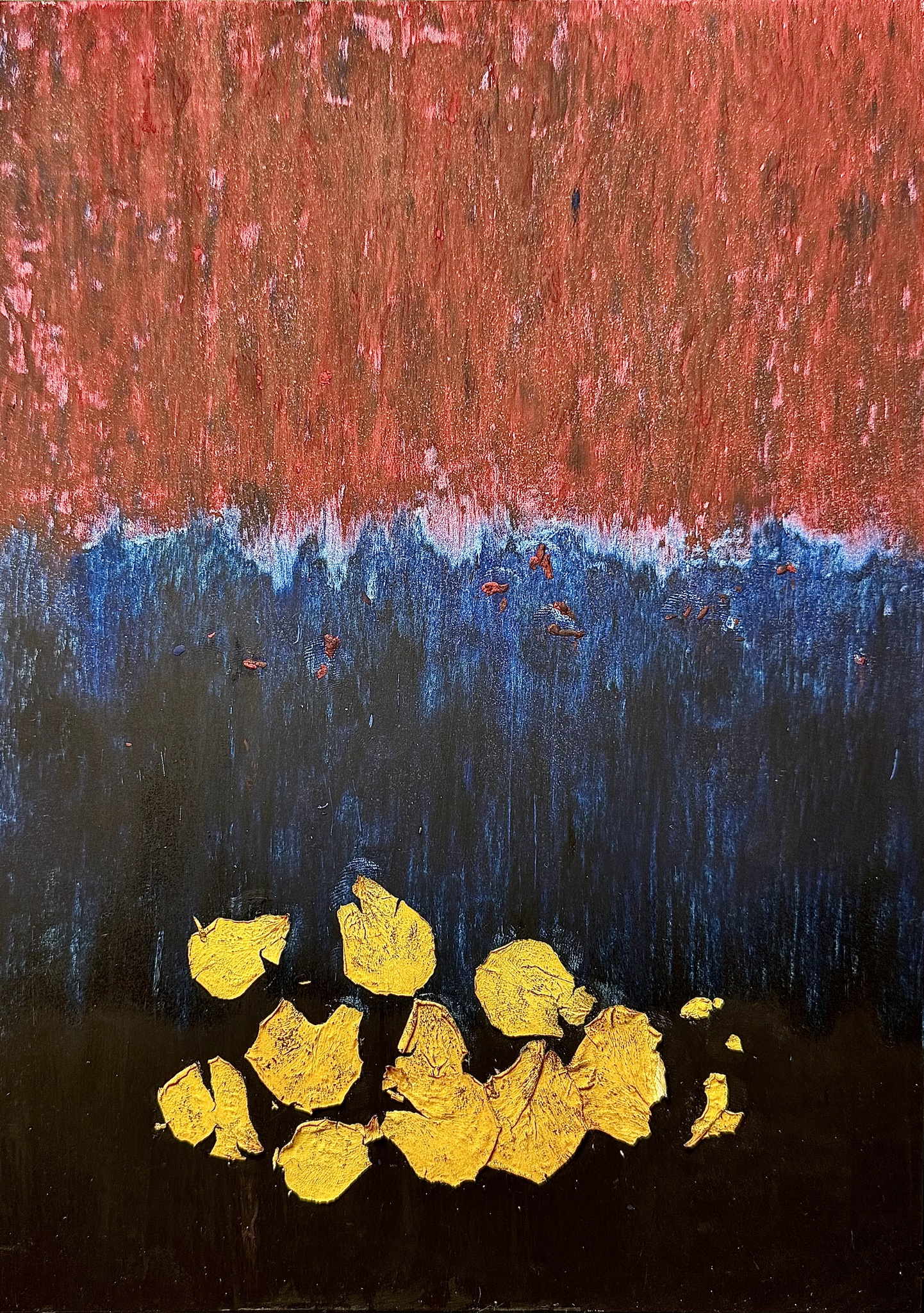 Mixed media on paper — oil pastel and real rose petals 21 x 29,7 cm 2025
