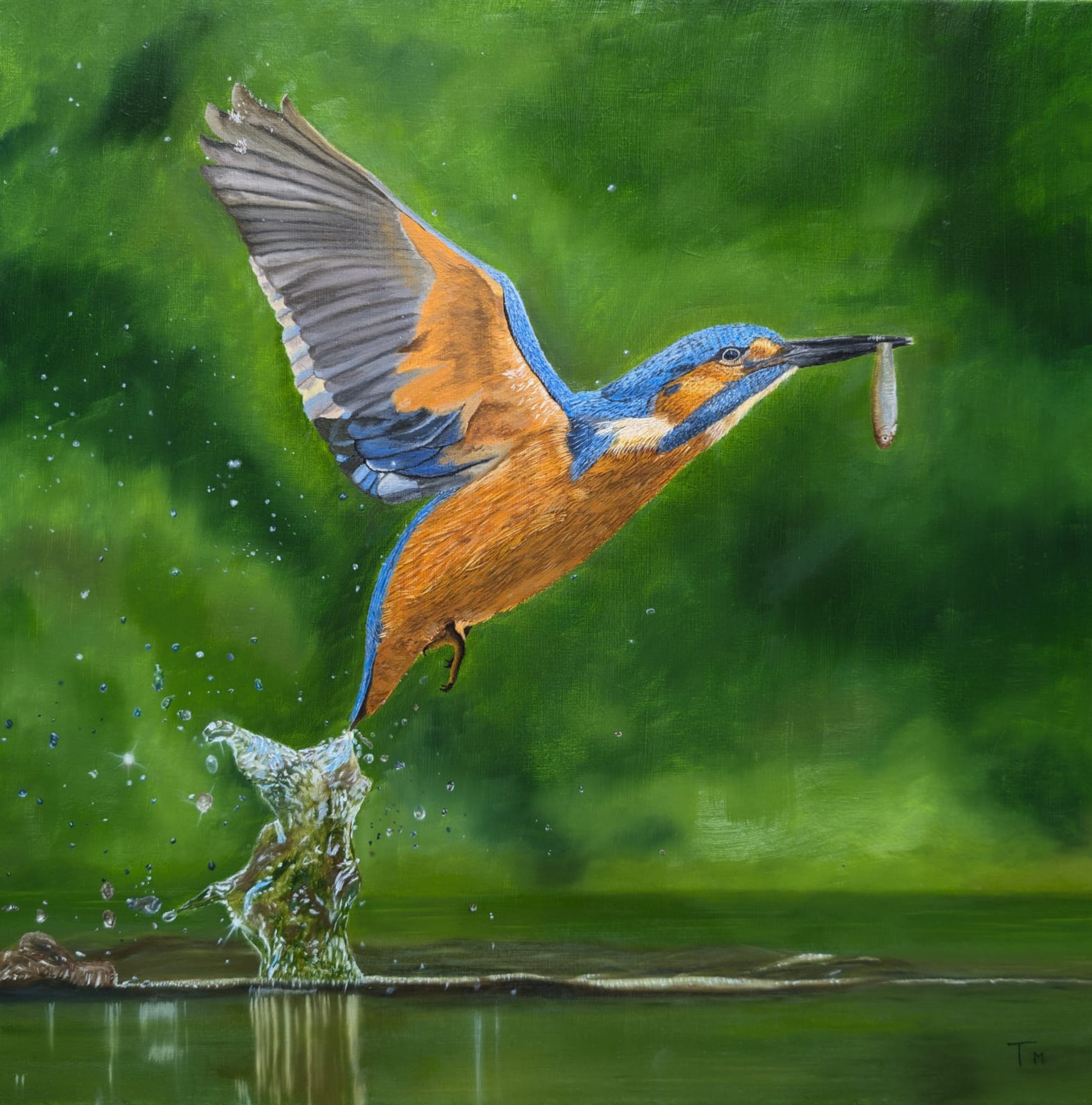 IJsvogel met vangst opvliegend uit water. Geschilderd naar referentiefoto met dank aan Michael James Smith.