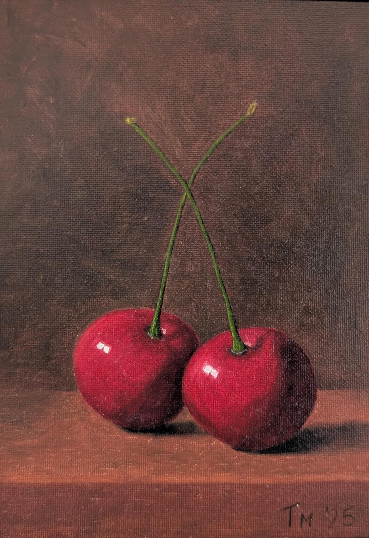 Twee kersen met groene stelen die elkaar kruisen op een tafel geschilderd in een klassieke stijl.