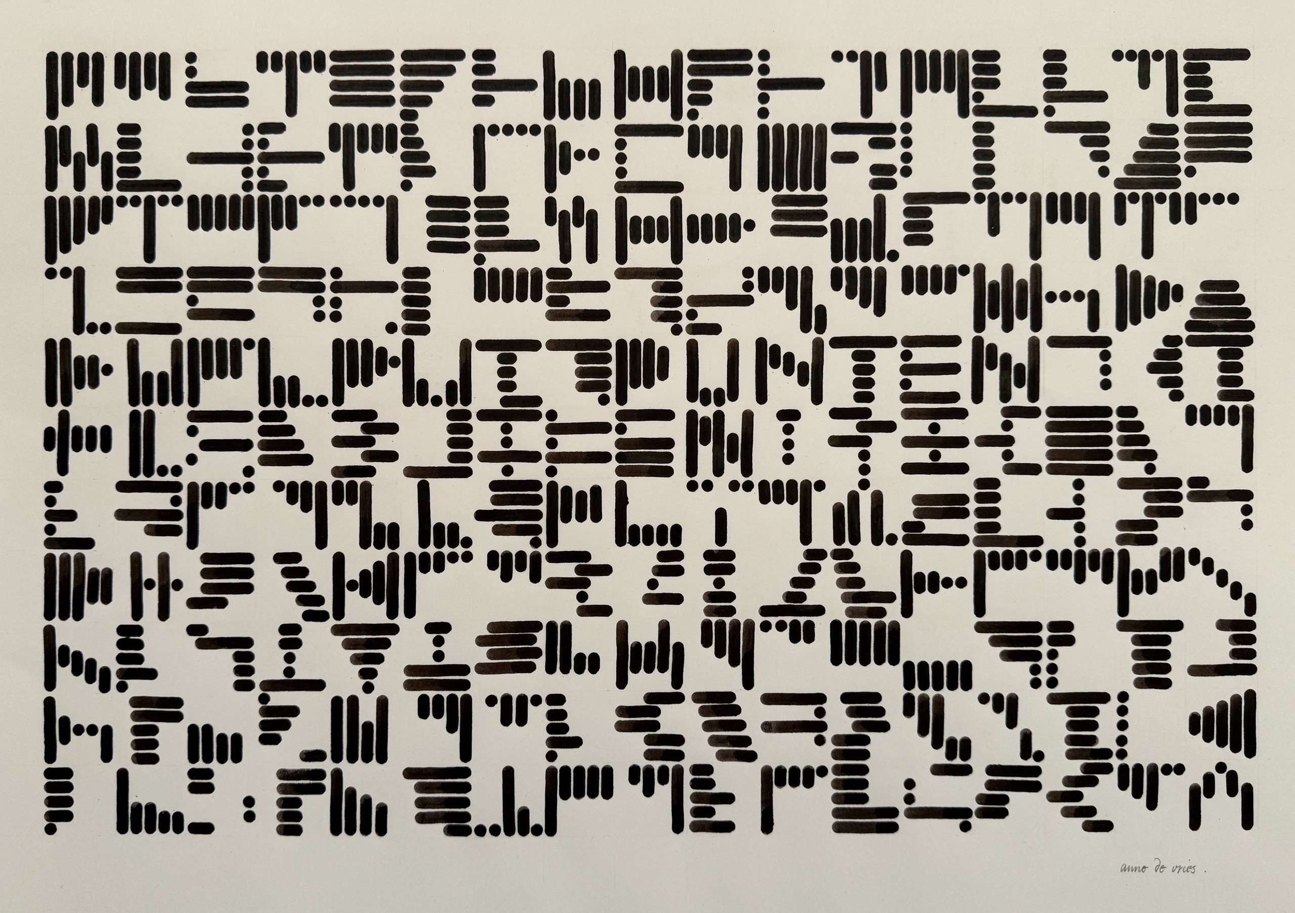 Een soort code-schrift. 17 x 11 vakjes gevuld met lijntjes en punten, gekalligrafeerd met een redispen en schrijfinkt op ivoorkarton.