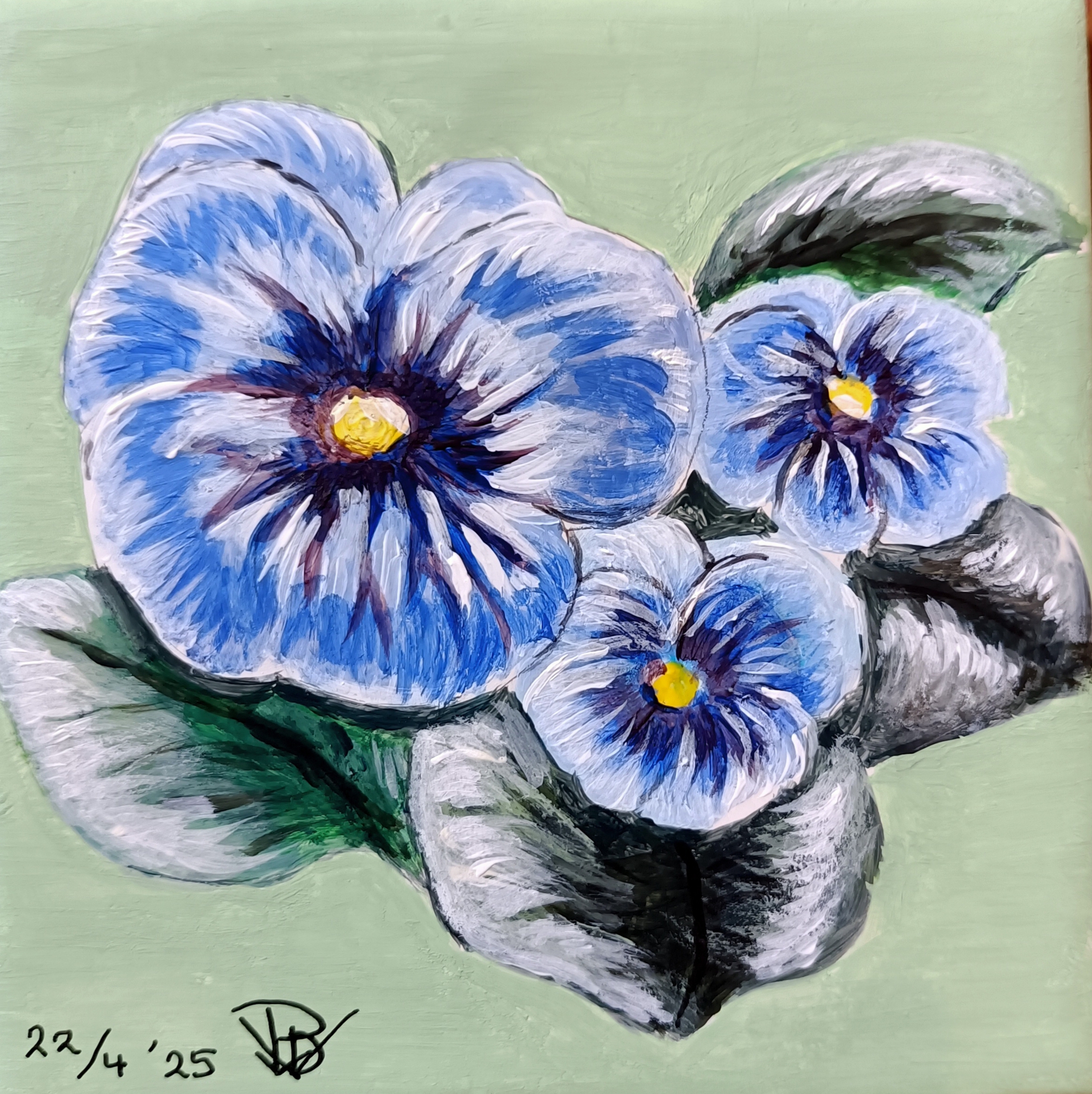 Viooltjes in blauw geschilderd met acryl op een tegeltje t.b.v. de verkoop en voor de inzameling voor een nieuwe huisvesting van het hospice in Woerden.