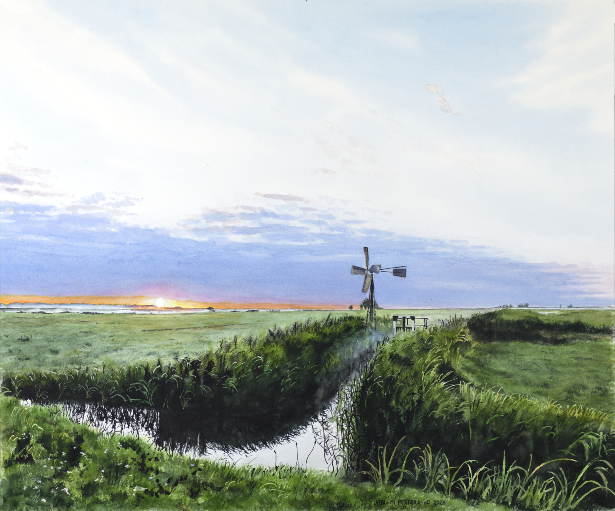 Aquarel naar een foto die ik op 13 juli 2017 rond 5:45 uur maakte van mijn geliefde Eempolder. De minimumtemperatuur was 8 graden. De polder kennende had ik mijn winterkleren aan: bepaald geen overbodige luxe!
