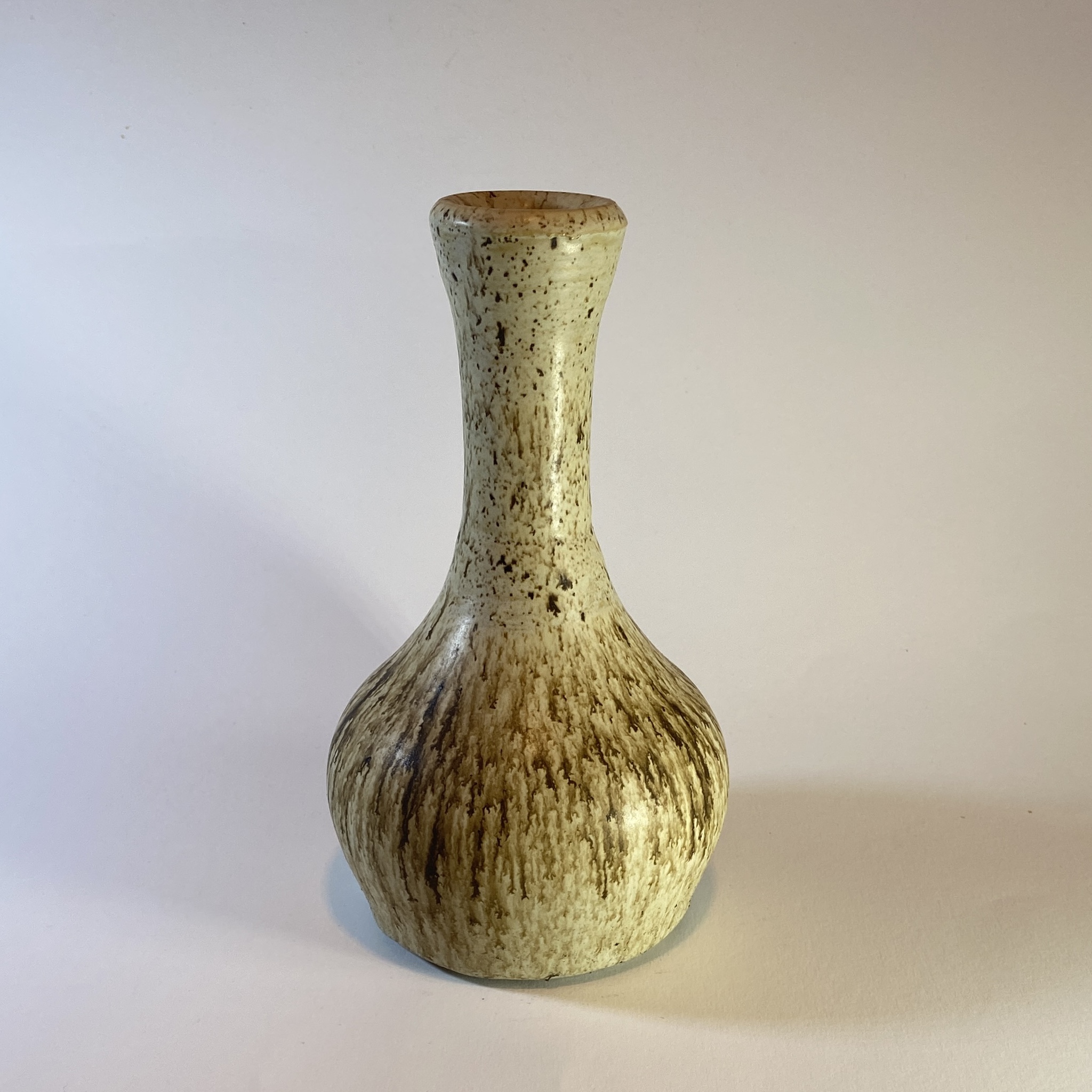 Klein vaasje (hoogte 16 cm) afgewerkt met winterwood glazuur en gestookt op 1240 C (steengoed) dus waterdicht.