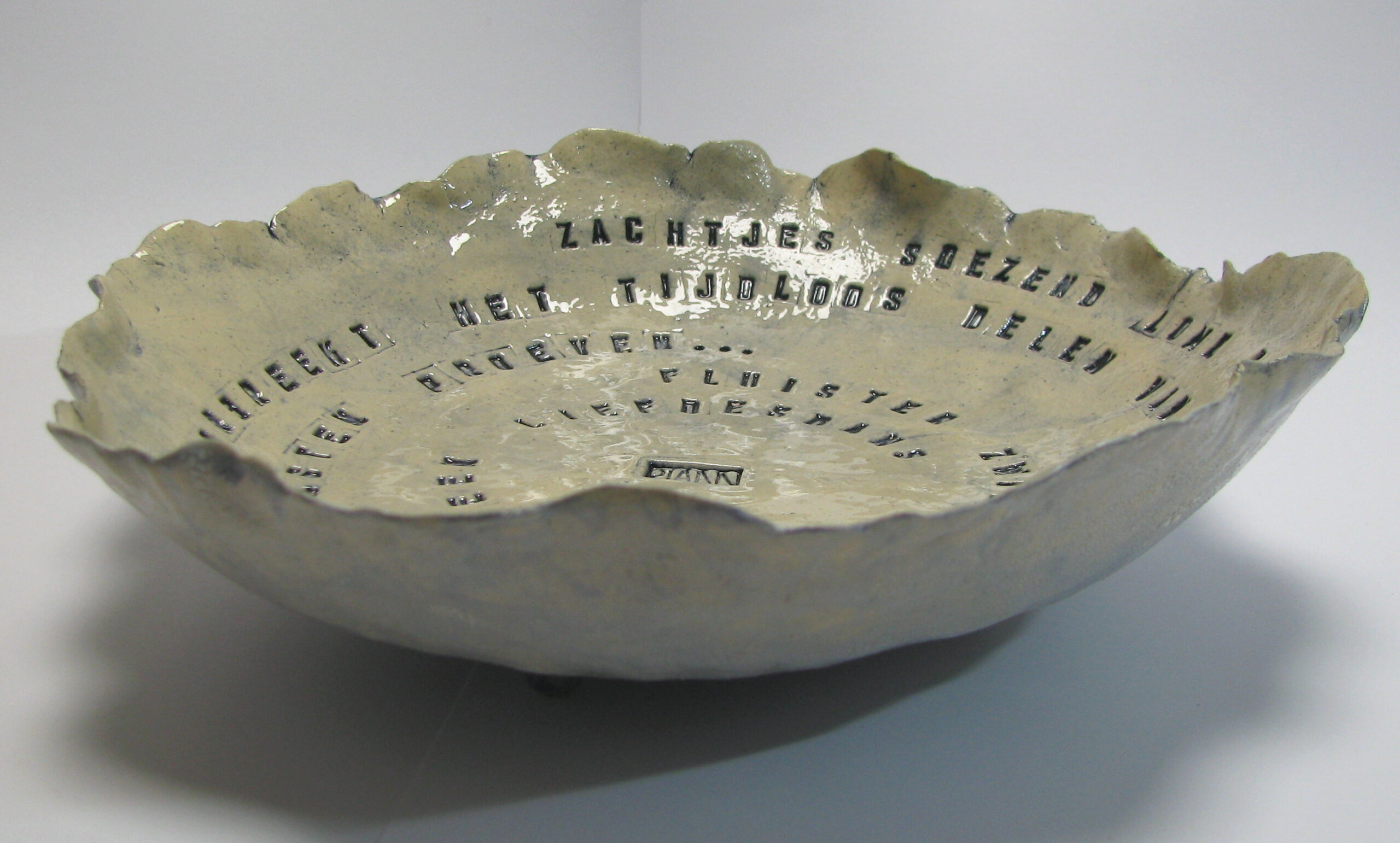 Het schaaltje staat op 4 kleine pootjes en is rondom geglazuurd. Het lyriek 'tijdloos' is per letter in de klei gedrukt.