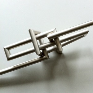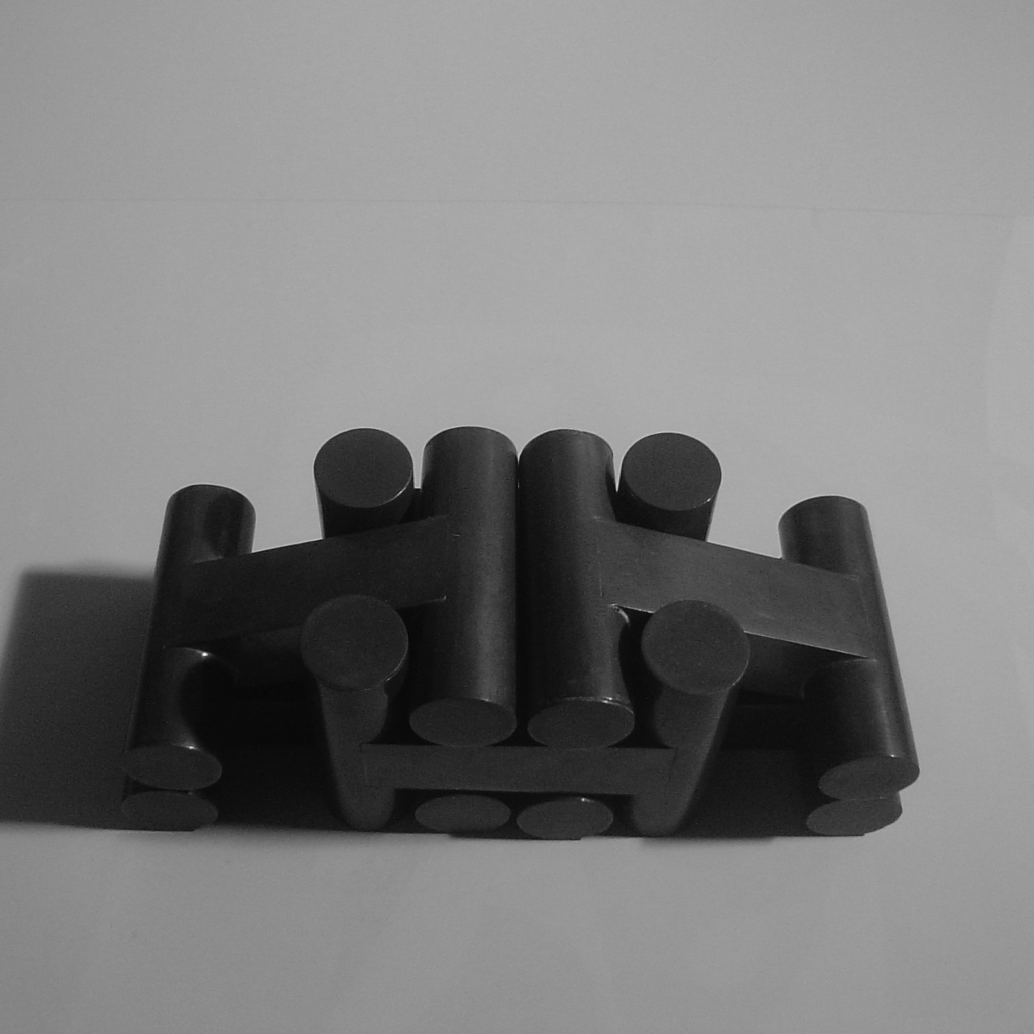 Zes identieke rood koperen elementen vormen samen een schakel. Een eenvoudig krachtig beeld.
