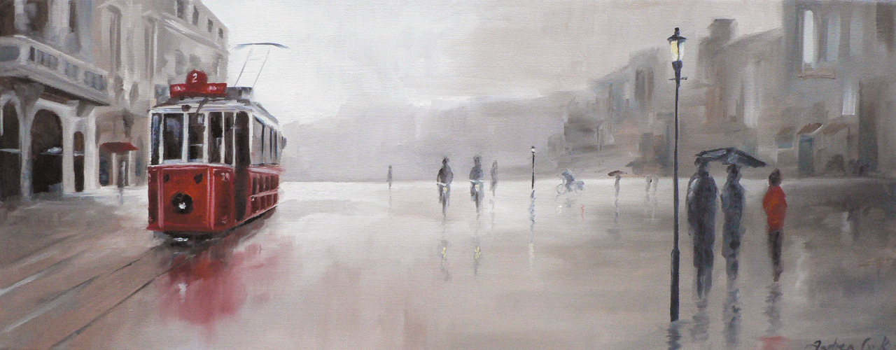 straattafereel met tram in de regen