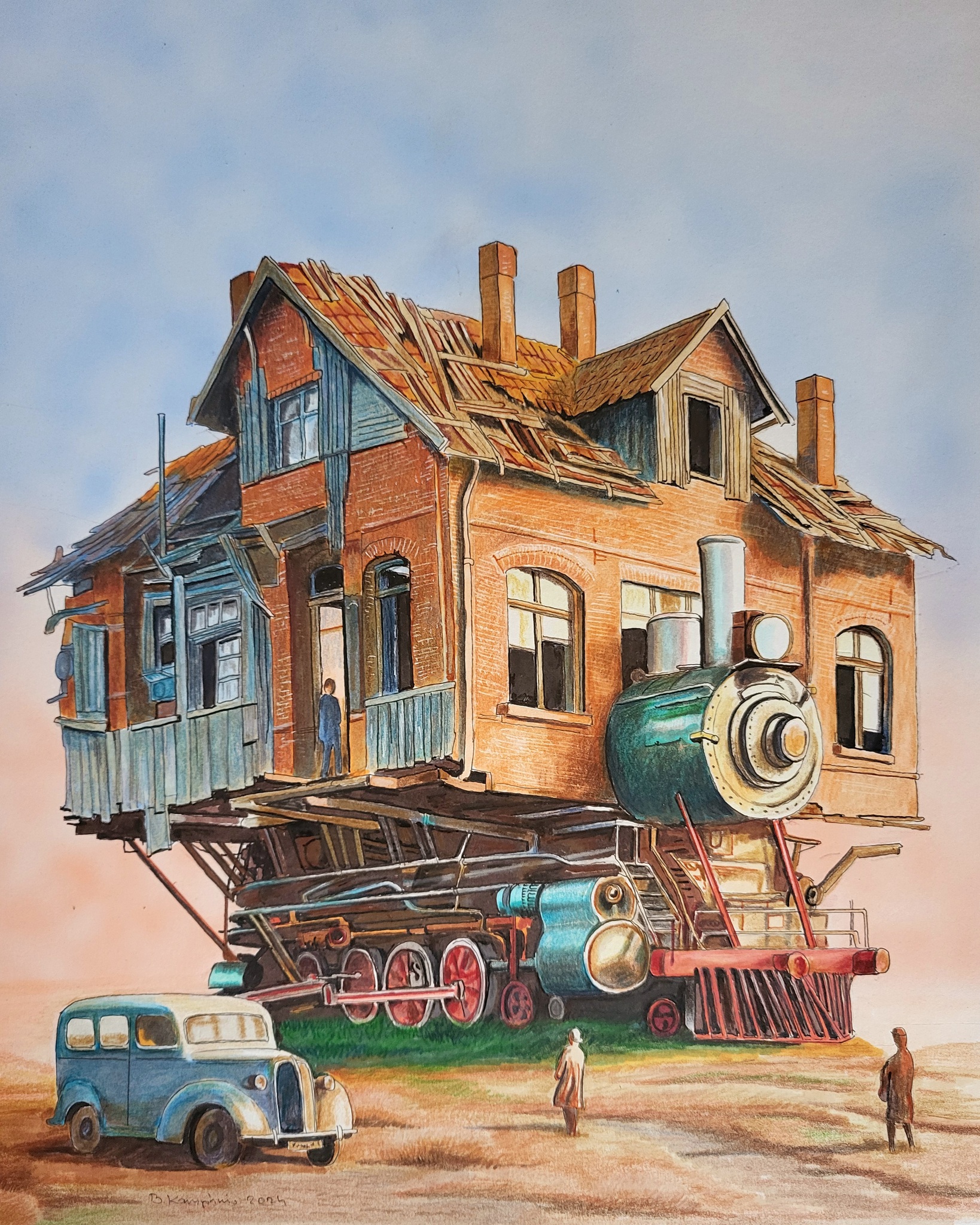 Een stenen huis is op een stoomlocomotief gebouwd.