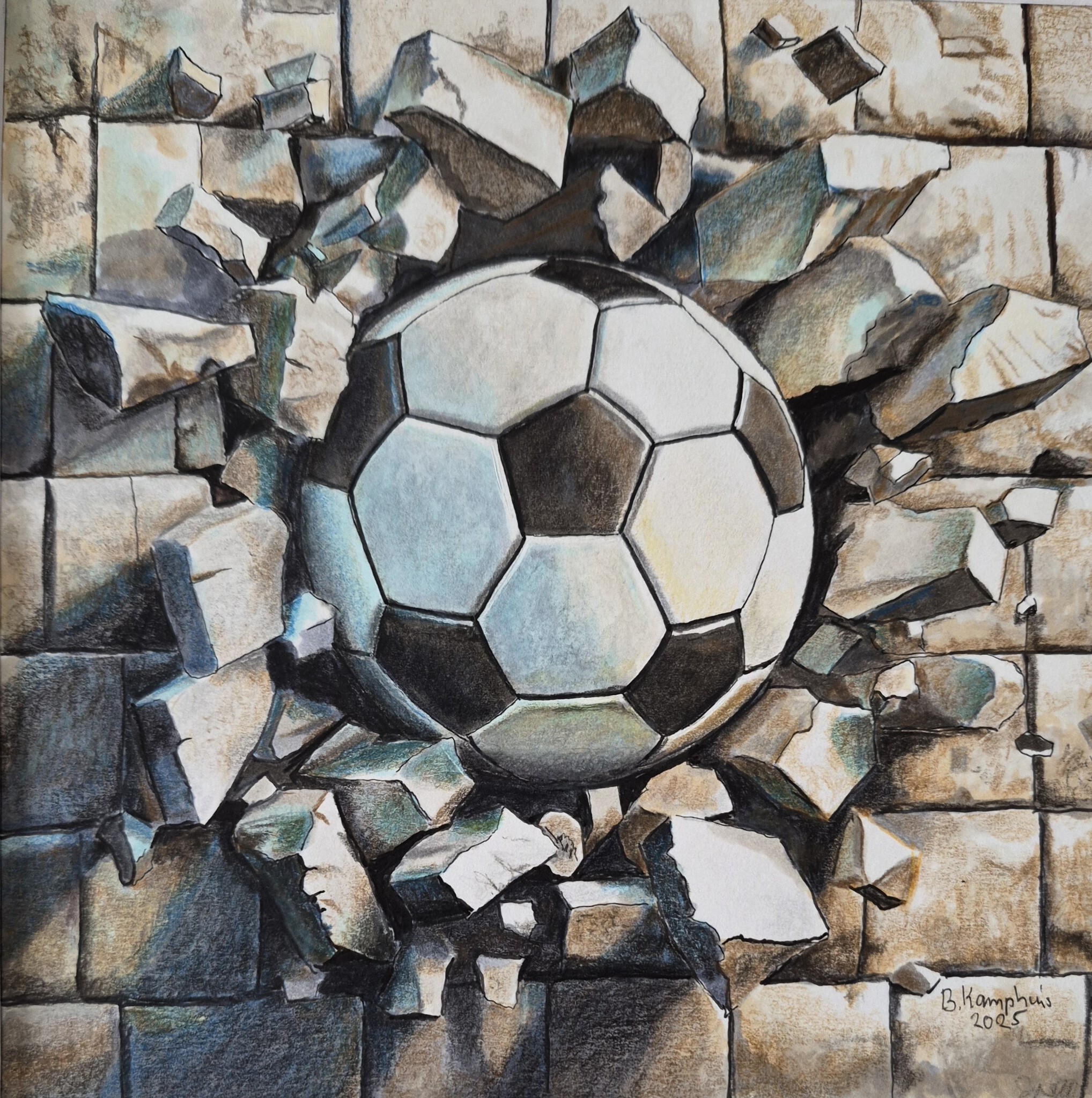 Een voetbal is zo hard tegen een stenen muur geschoten, dat deze het heeft begeven