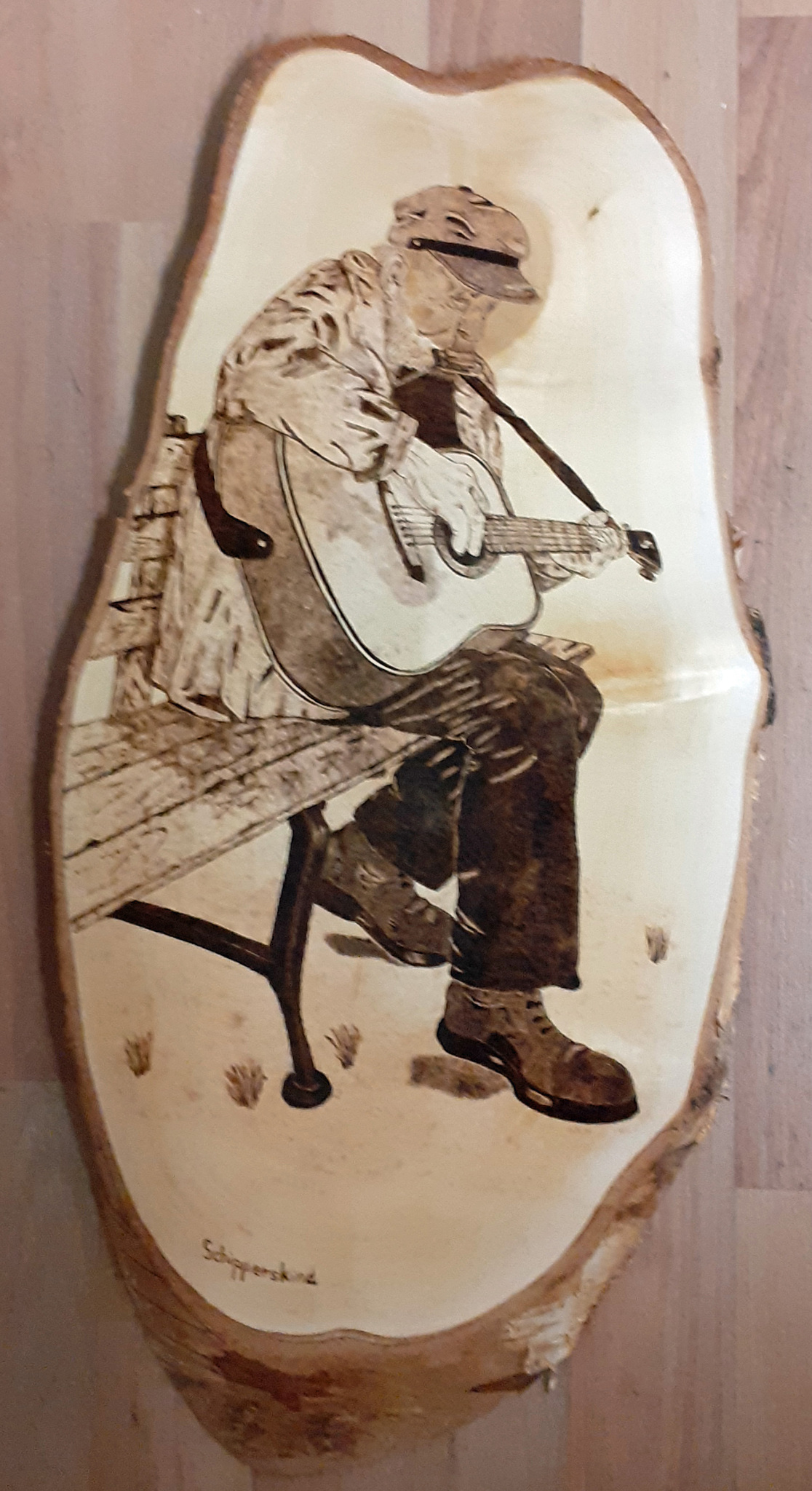 Old Blues Muzikant Pyrografie Houtbranden Boomschijf Schipperskind