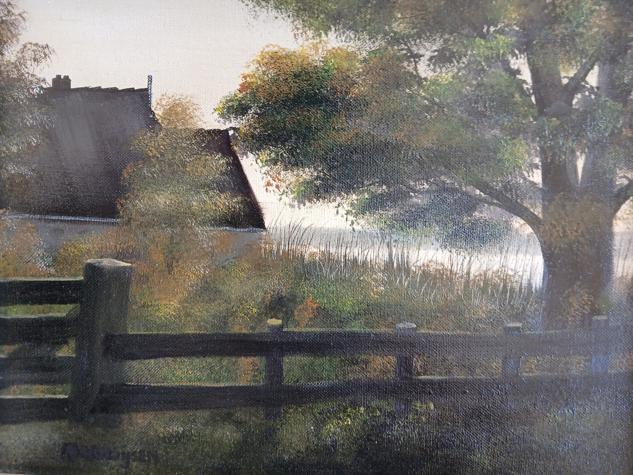 Boerderij. Geschilderd op oud linnen met olieverf.