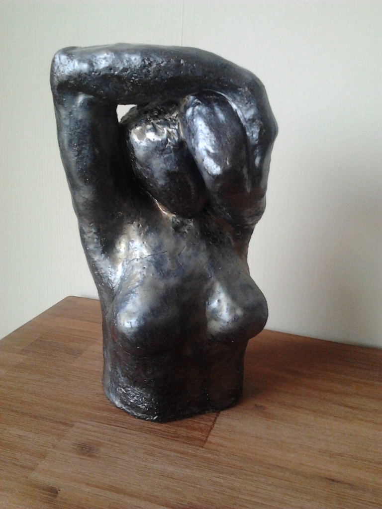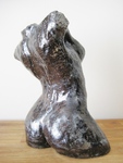 Damesfiguur in 'yogahouding', olievlekglazuur.