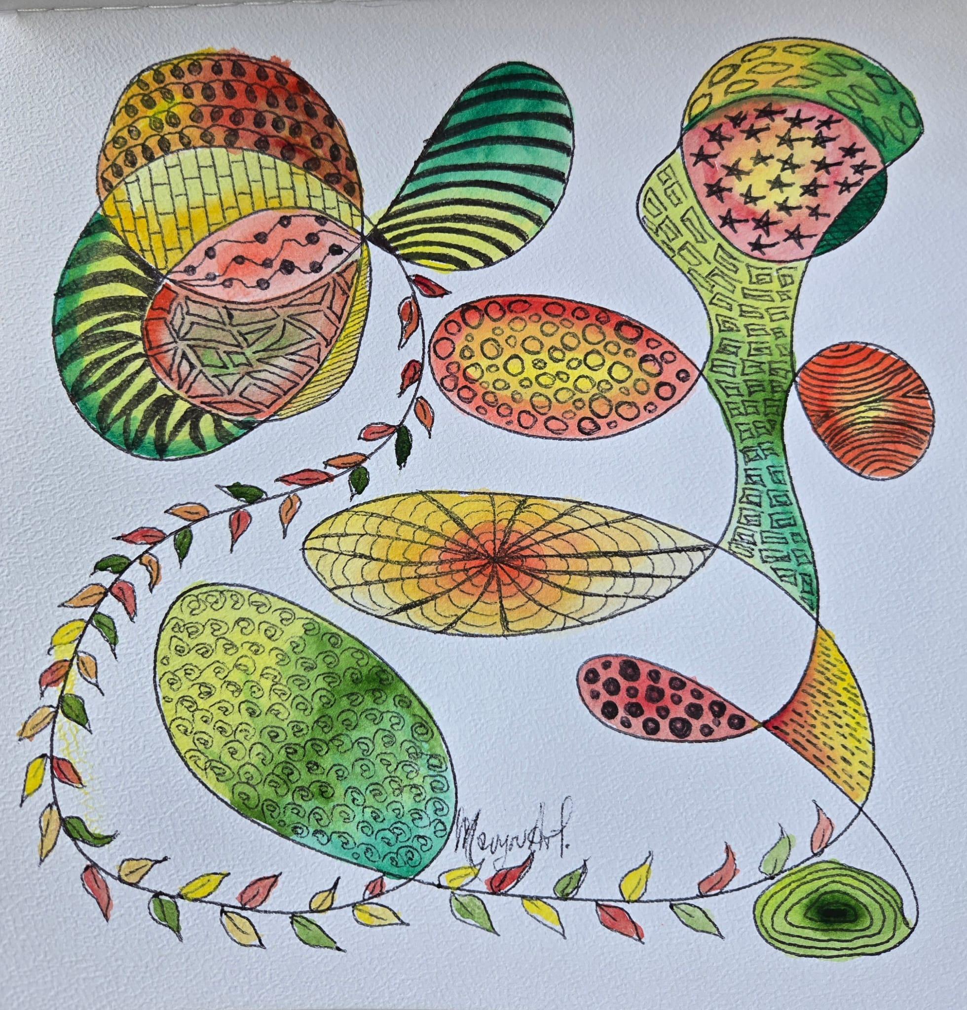 Ik begin met niets en laat m'n pen het werk doen. Daarna bewerk ik het design met aquarel. De uitkomsten zijn even verrassend als bewust.