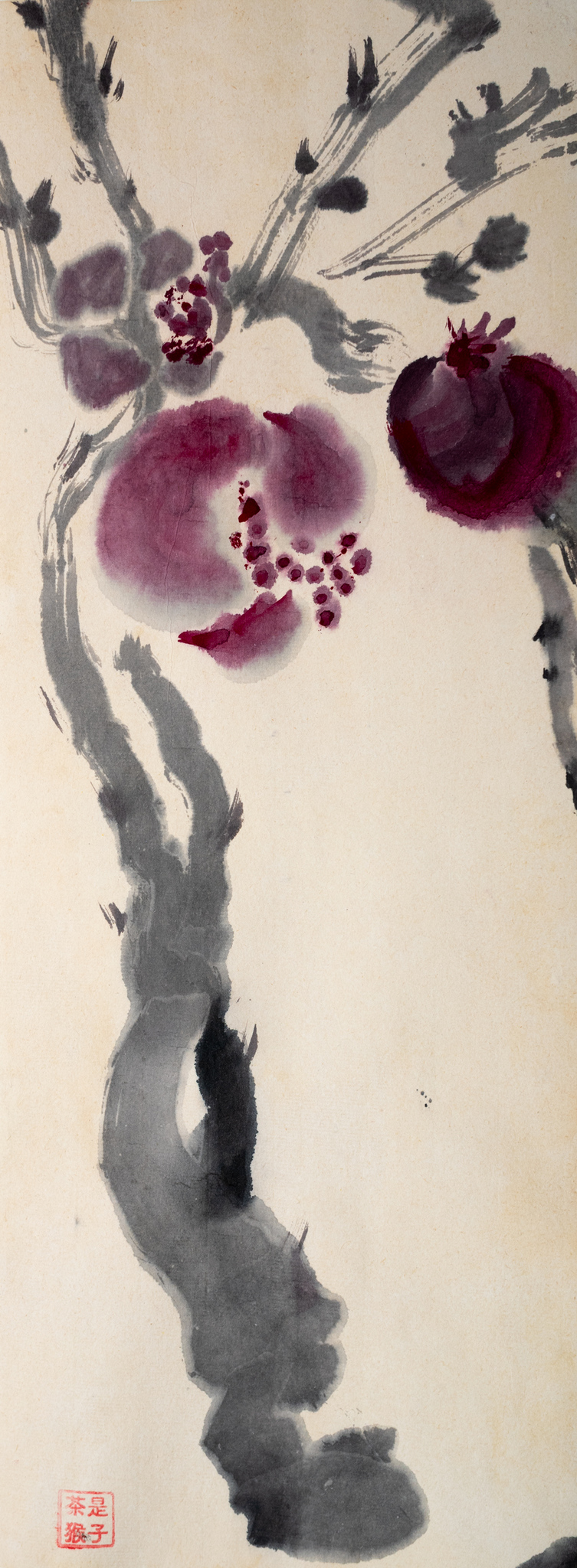 Zakuro (granaatappelpit) is een symbool van de vruchtbaarheid. Inkt en waterverf op rijstpapier.