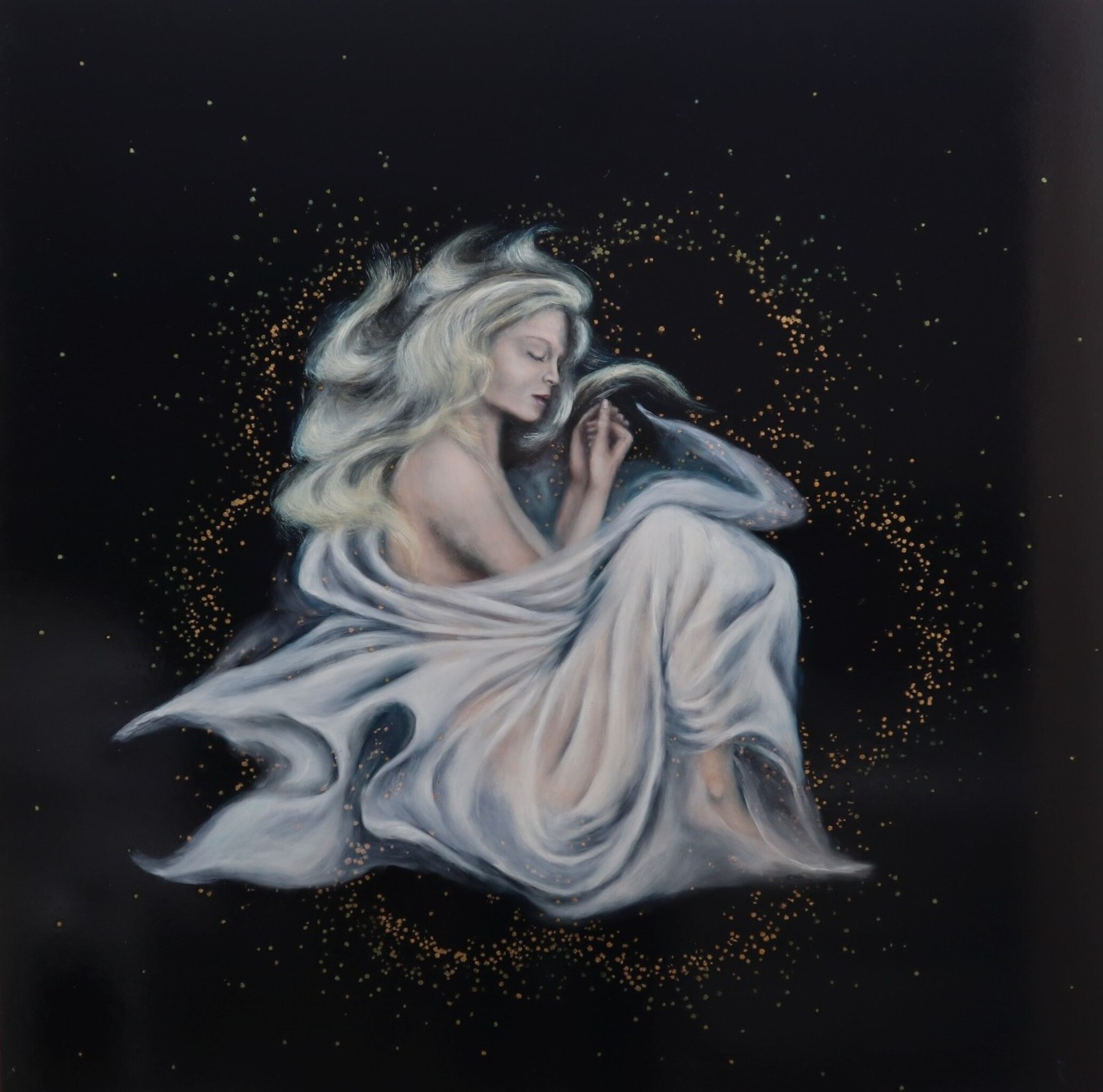 Ik schilder met olieverf. Mijn onderwerpen worden geïnspireerd door ons bewustzijn, het hogere, onsterfelijke liefde, mens met zijn gevoel, onvolkomenheid, en toch geschapen met goddelijke perfectie.