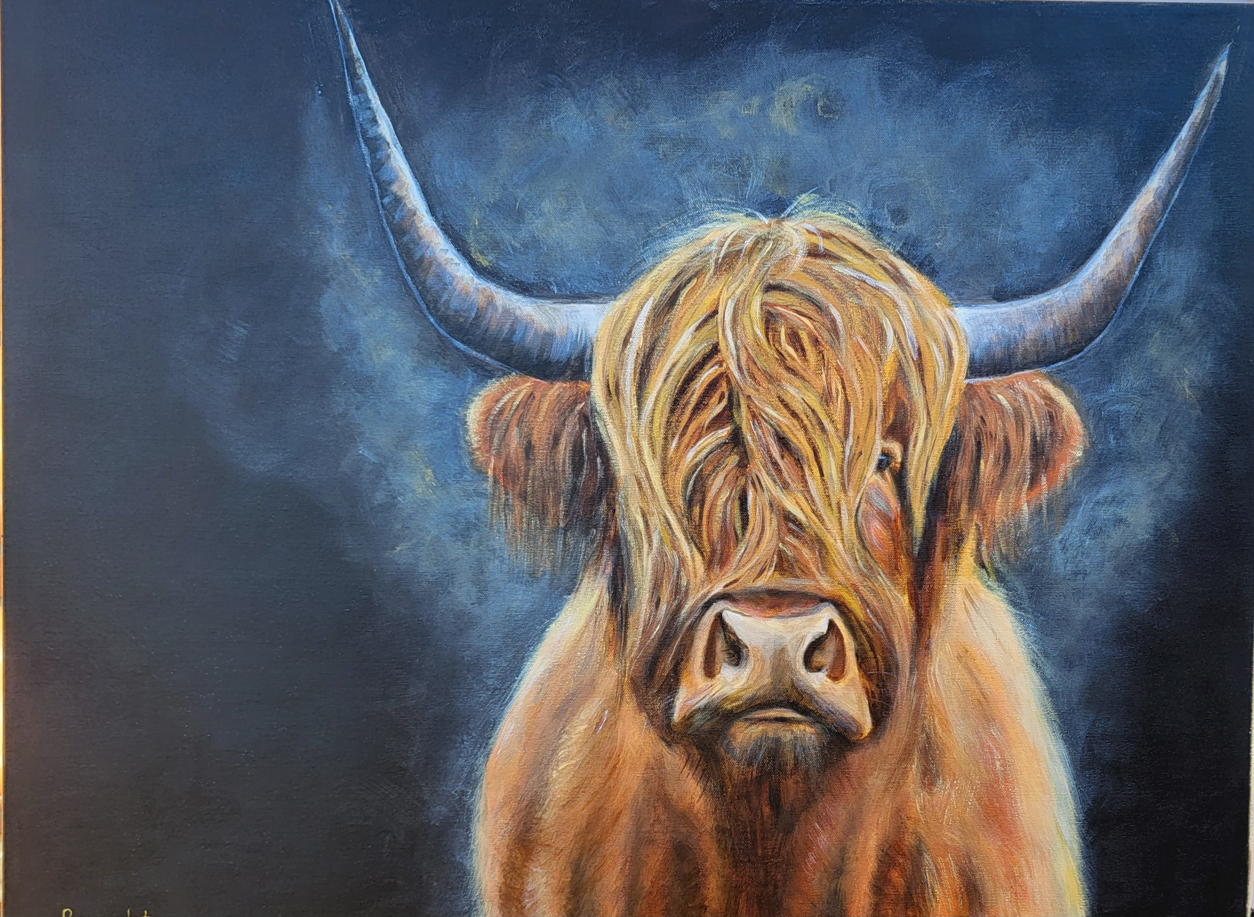 Dier Beweging Hooglander Koe Donker Neus Krachtig Horens Vacht Natte Harig Acryl Doek Realistich
