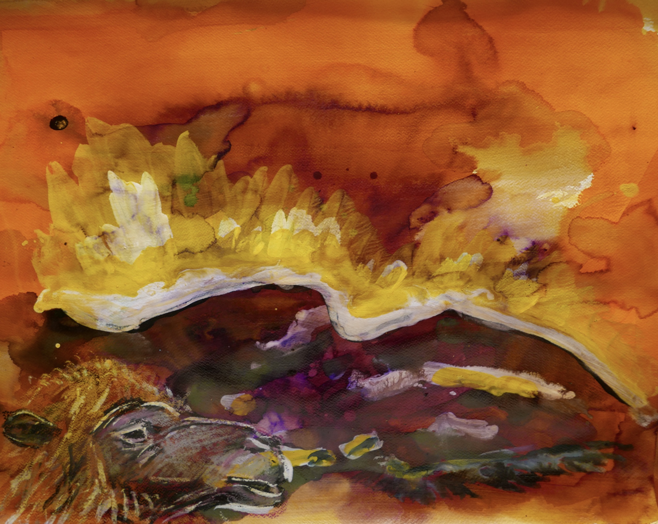 watercolour, pigment, oilpastel op papier: kameel in en landschap