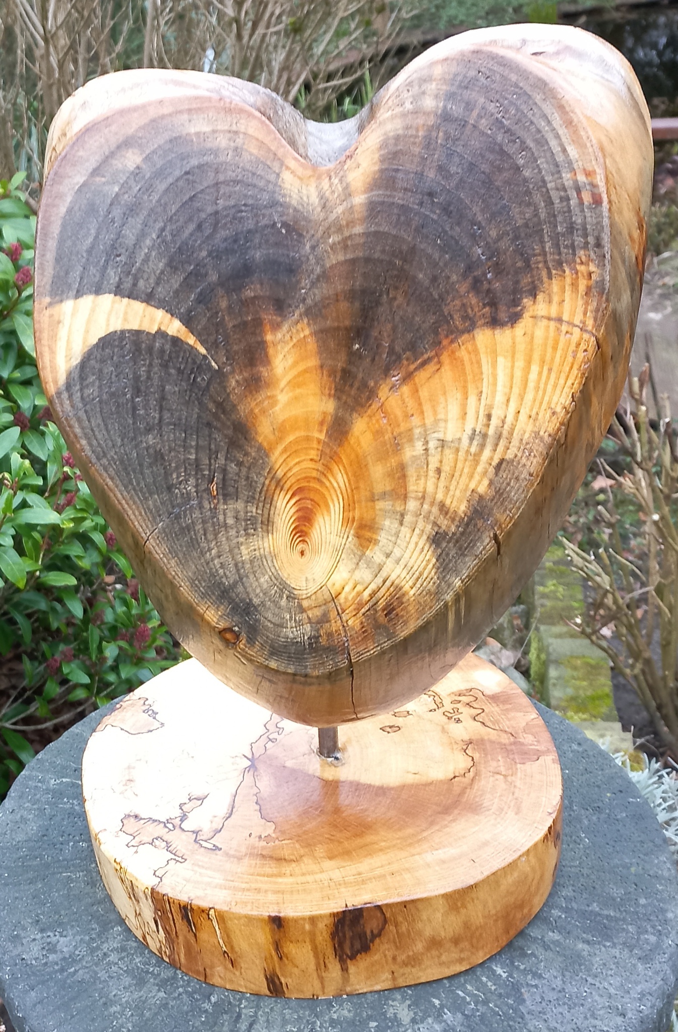 Een grove den die ik al 8 jaar had liggen heb ik verwerkt tot een heel subtiel kunstwerk eigenlijk zou hij op een draaischijf moeten staan want hij is overal het aanschouwen waard.
