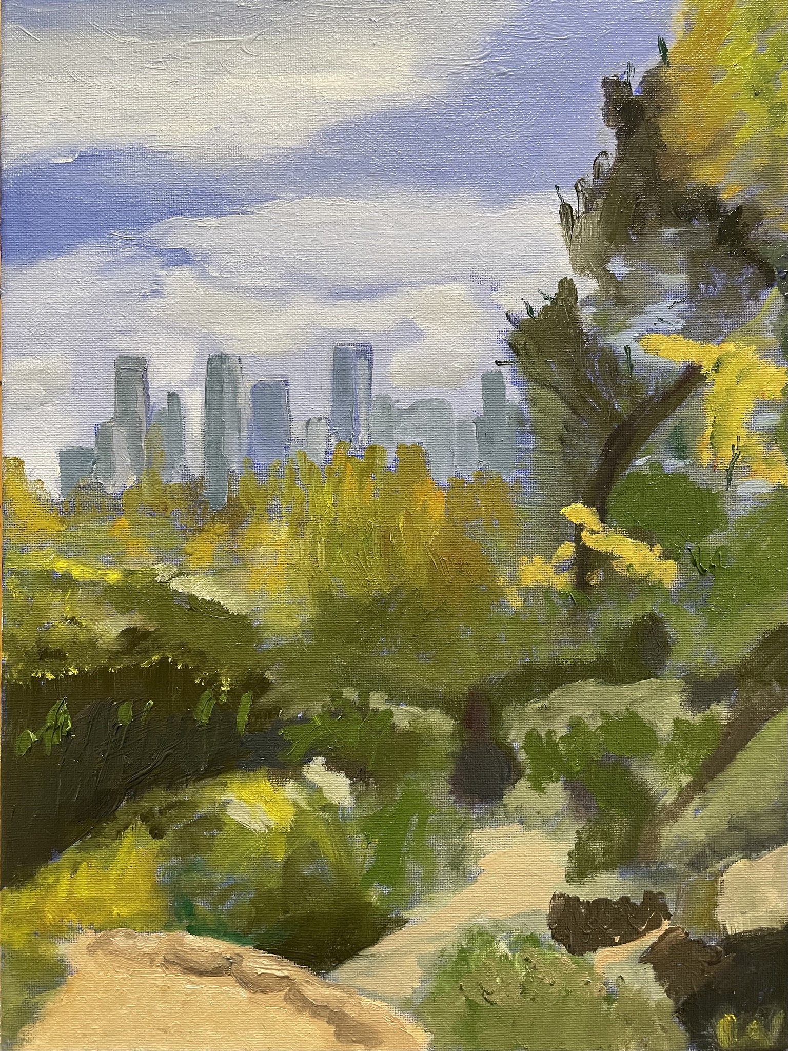 Verstening. Oprukkende stad. Skyline. Olieverf.