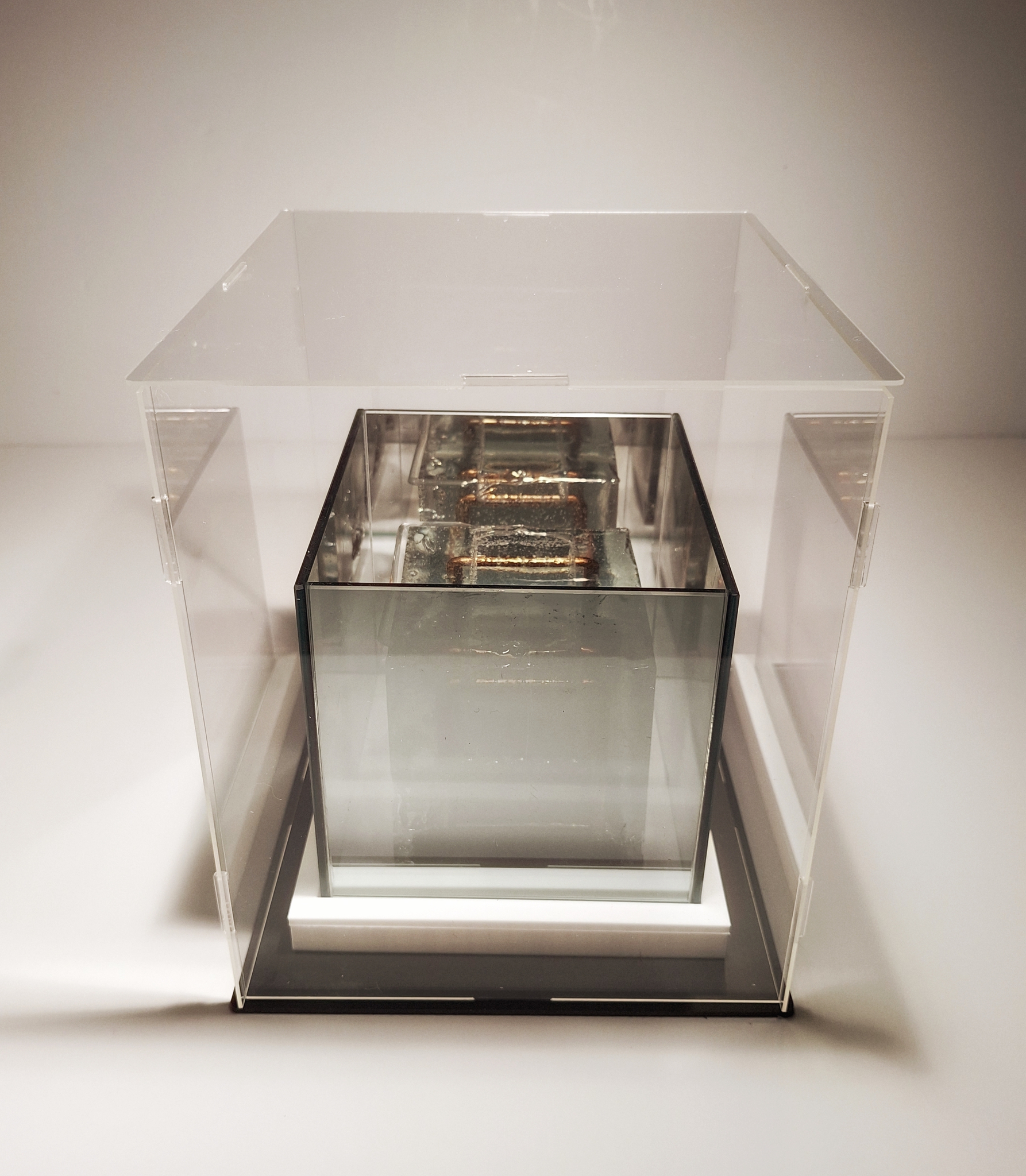 Pure Science centers on a cheap Newton’s cradle cast into a resin block. The casting introduced air bubbles, distortions, and chemical impurities, clouding the material and allowing the metal structure to oxidize. A device normally used to illustrate perfect causality and Newtonian determinism thus becomes partially unreadable and materially unstable. The cube sits inside a second-hand mirrored structure that endlessly multiplies its image. This assembly is placed on a neutral white pedestal and enclosed in a plexiglass box. These successive layers create distancing frames that both separate the viewer from the object and elevate its authority. The work draws on Thomas Kuhn’s view of scientific knowledge as shaped by paradigms that structure perception and interpretation. The resin’s defects act as visual analogues of Kuhnian anomalies—small irregularities that accumulate until a model loses its apparent clarity. Instead of staging a dramatic scientific revolution, the piece shows how a compromised model persists through reflection, preservation, and institutional display. The pedestal turns the damaged object into an authorized exhibit. What appears as unstable or failed knowledge is stabilized through museological framing, suggesting that scientific truth emerges not only from experiment and theory but also from (sociological) practices of presentation, validation, and collective recognition. Pure Science examines how systems of knowledge endure even as their material and conceptual foundations begin to erode.