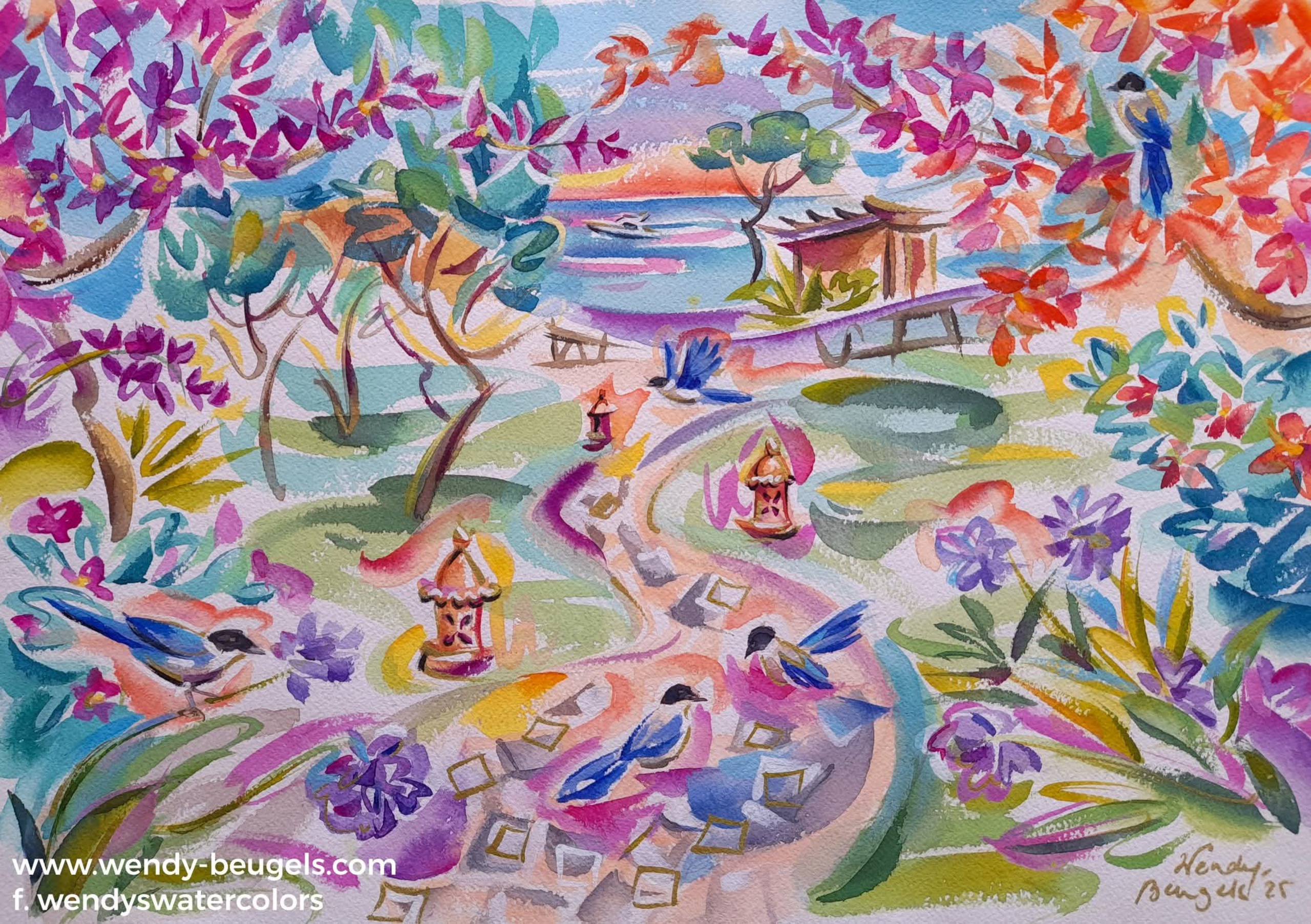Happy Watercolor inspired by Pine Cliffs with blue magpies and bougainvilleas.