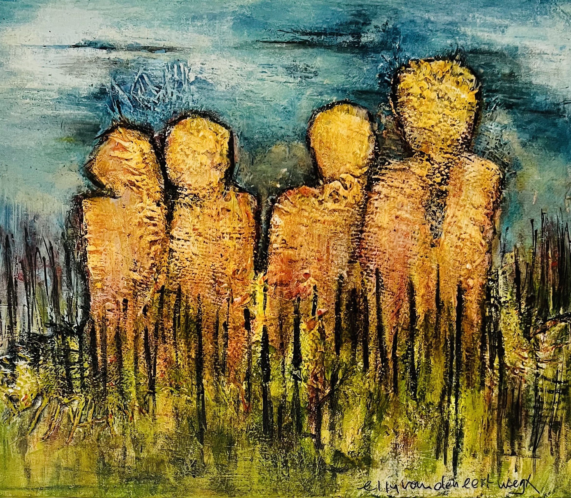 Mijn schilderijen: olie-en acrylverf , gemengde technieken, diverse maten. Mijn Keramische Beelden: geglazuurd of bewerkt andere materialen. Mijn Urnen/Herinneringsbeelden: gemengde technieken