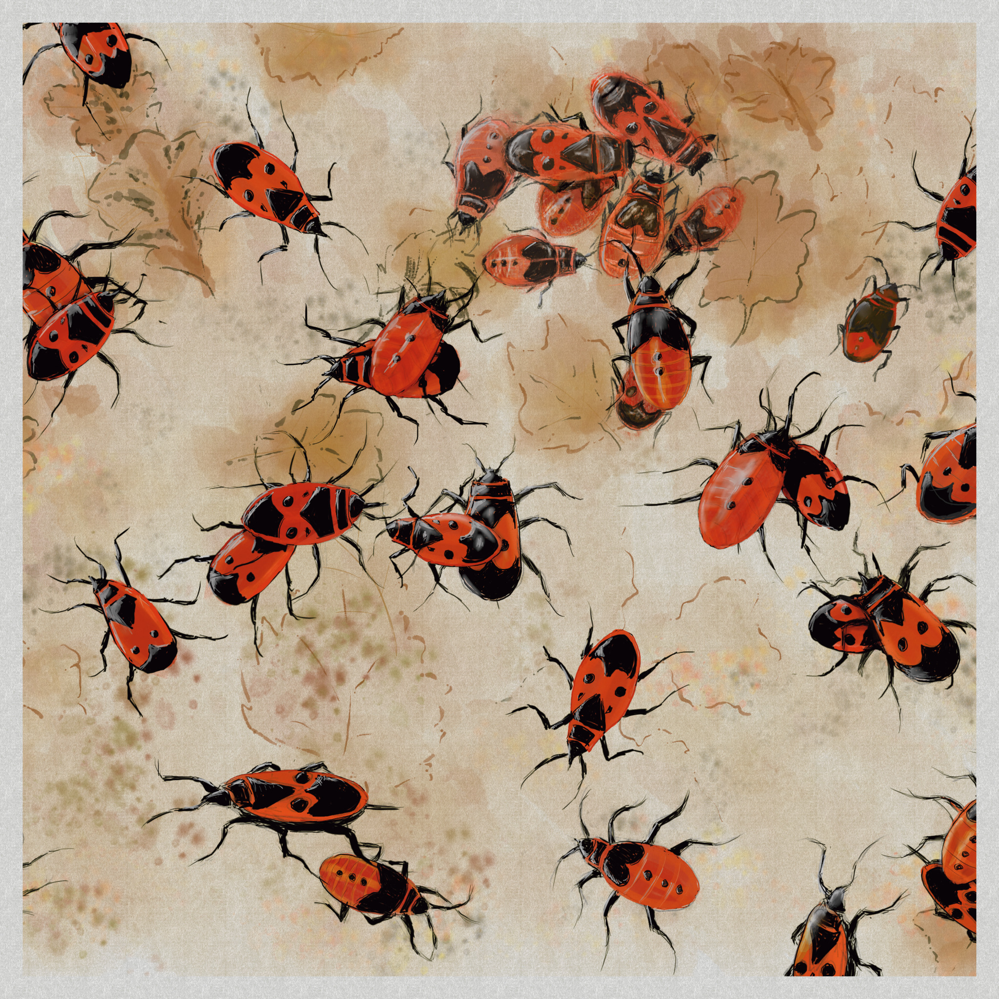Ik was er toen zelf nog niet bij, ik krioelde toen nog in een warm nest met een andere tekening. Een atmosfeer van rood, in de broeiende warmte van een bladerdek. Dicht bij de aarde leefde ik met mijn broeders en zusters, warm en geborgen. Het was alsof de adem die leven geeft, het nest doorwoei, als een zwoele deken die zich telkens opnieuw over ons uitstrekte. Digitaal in krita, afdrukken kunnen op maat gemaakt worden