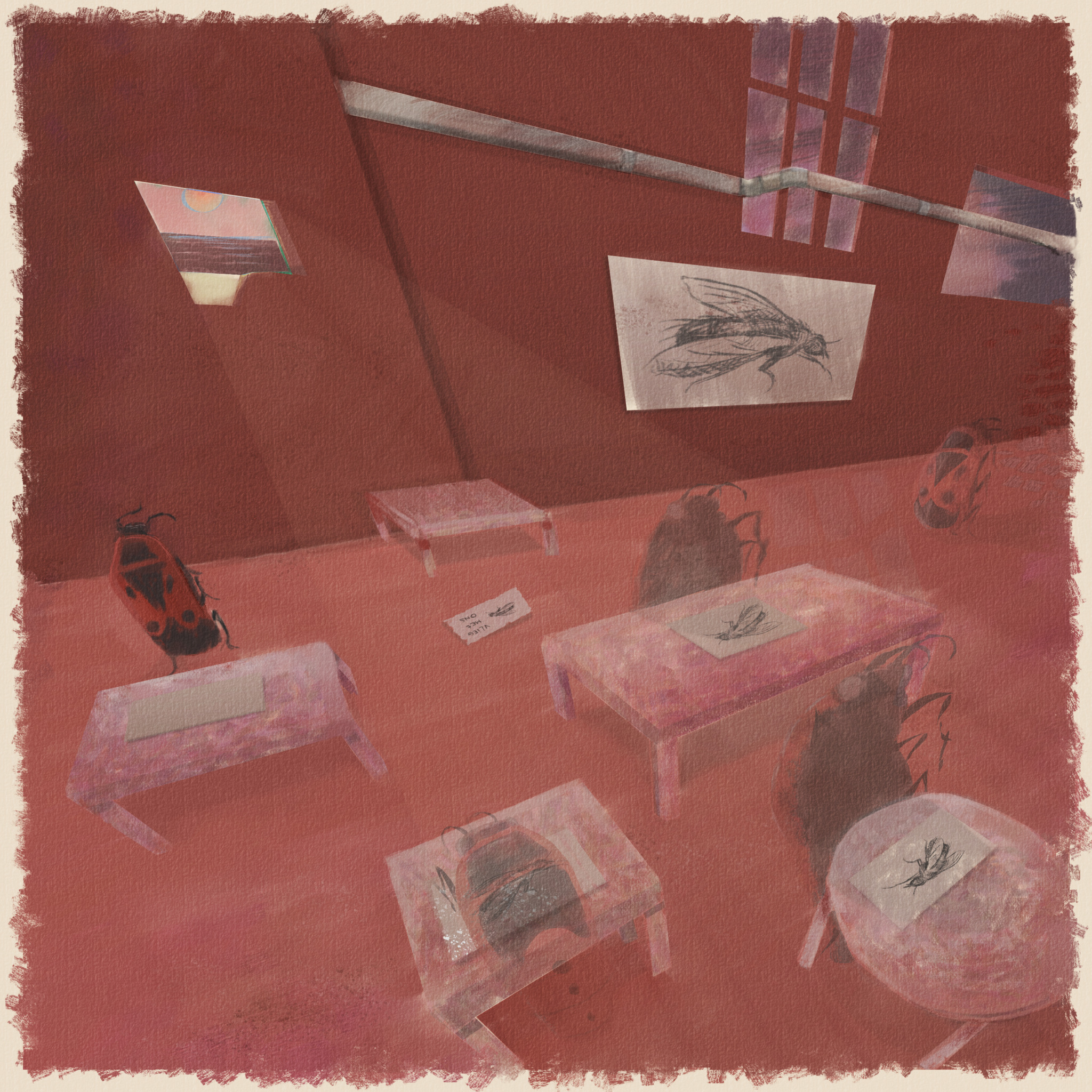 Hoe je schild glansde, toen je het museum binnen danste Niet langer larve, beminnelijk beginnend wants Diepzwarte welving op rood glimmend chitine, drie stippen Inspiratie bruisde aan de binnenkant Snuffelend aan uitingen in vitrines Misschien voorbestemd tot aan Ruach zijn linkerhand Als je het in je had kwam het uit je Je had toen voelsprieten, nu heb je een plaksnuitje Digitaal in krita, afdrukken kunnen op maat gemaakt worden