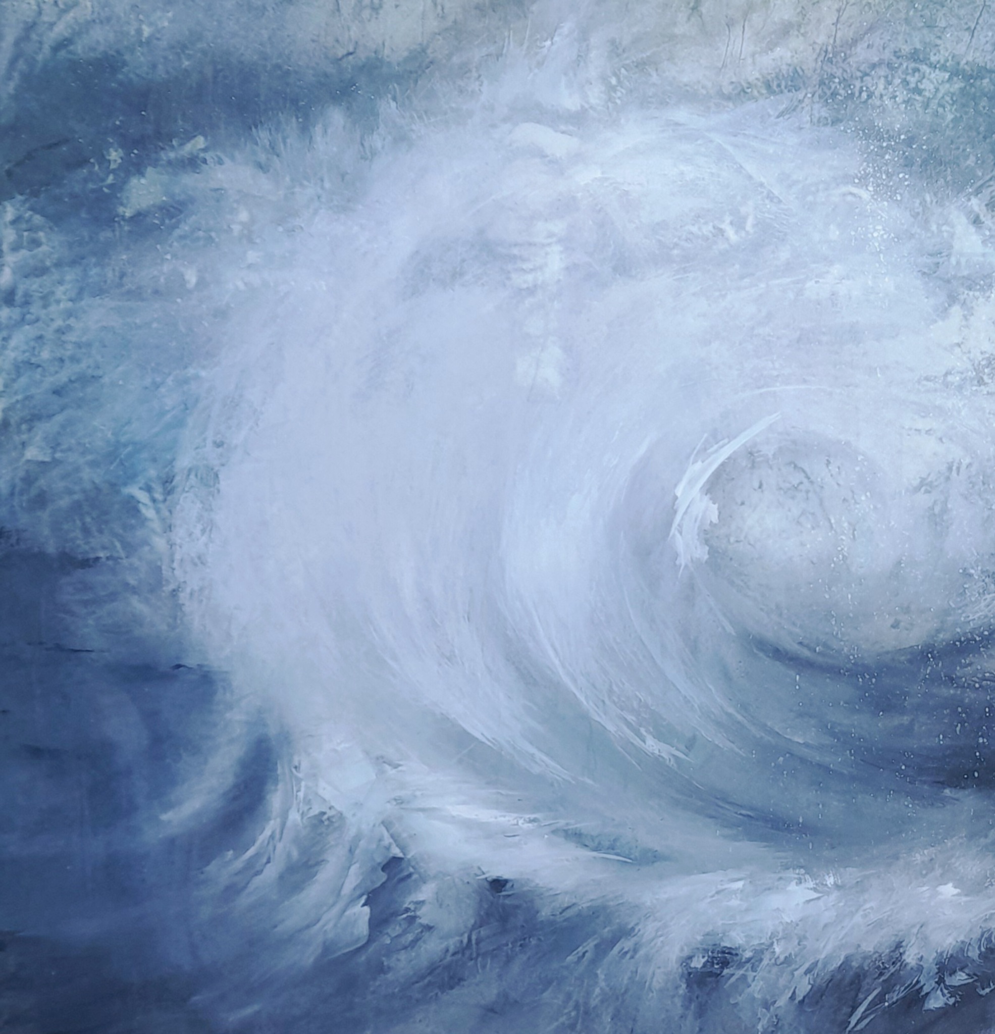 Gemengde techniek, afdruk van een portret op doek. Nadien een impressie van een opspattende golf met in witte, zwarte, blauwe en groene ecoline aangebracht met een penseel en uitgewassen met een spons om hier en daar de ondergrond van de foto te doen laten uitkomen.