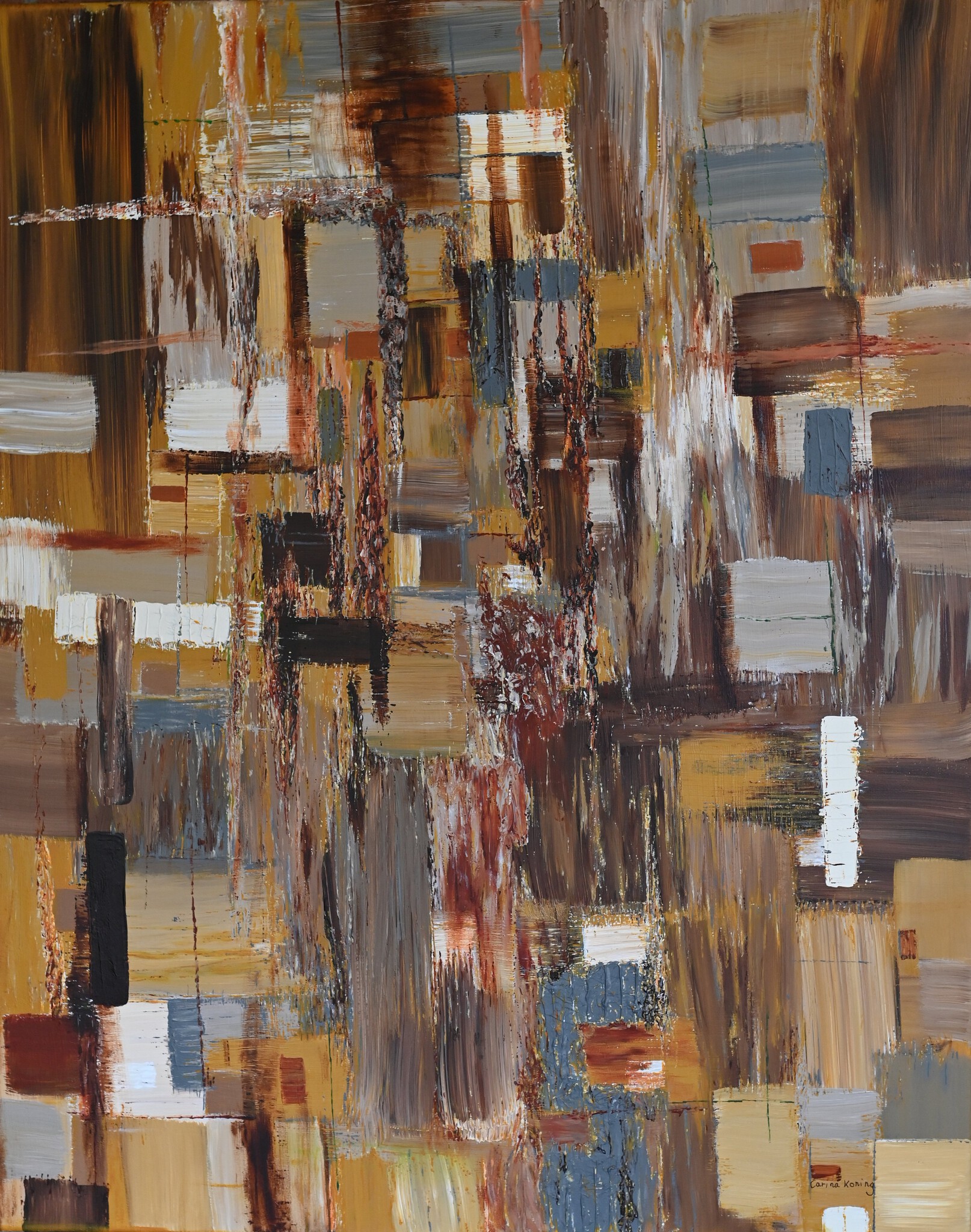 Carina schildert abstracte schilderijen met een diversiteit aan kleuren, lijnen en vormen. Andere schilderijen van haar hand zijn verstilde weergaven van een kustlijn, stadsgezicht en landschap.