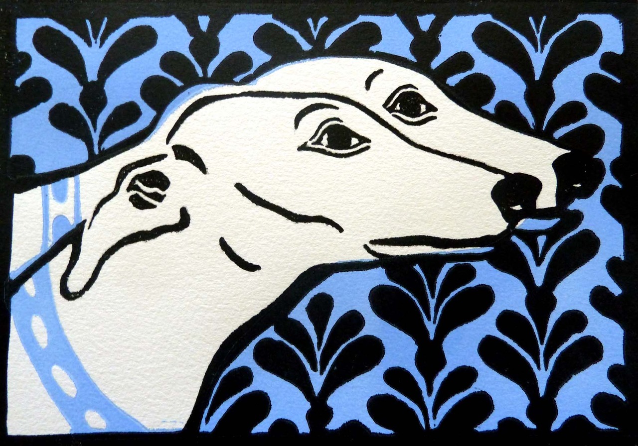 Wit Zwart Blauw Honden Blue Black White Print Dogs Windhonden Linocut Linoleumsnede Tweekleurendruk Art-deco Greyhounds