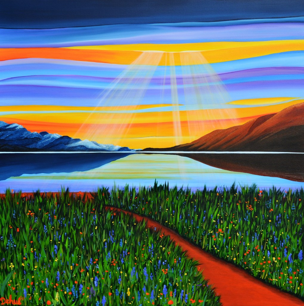 Figuratief Geel Landschap Blauw Paars Groen Bloemen Bruin Licht Kleurrijk Natuur Bergen Abstraherend Stralen Landscape Weerspiegeling Spiegeling Reflectie Horizon Roodbruin Meer Lichtval Landschappen Fantasielandschap Dream