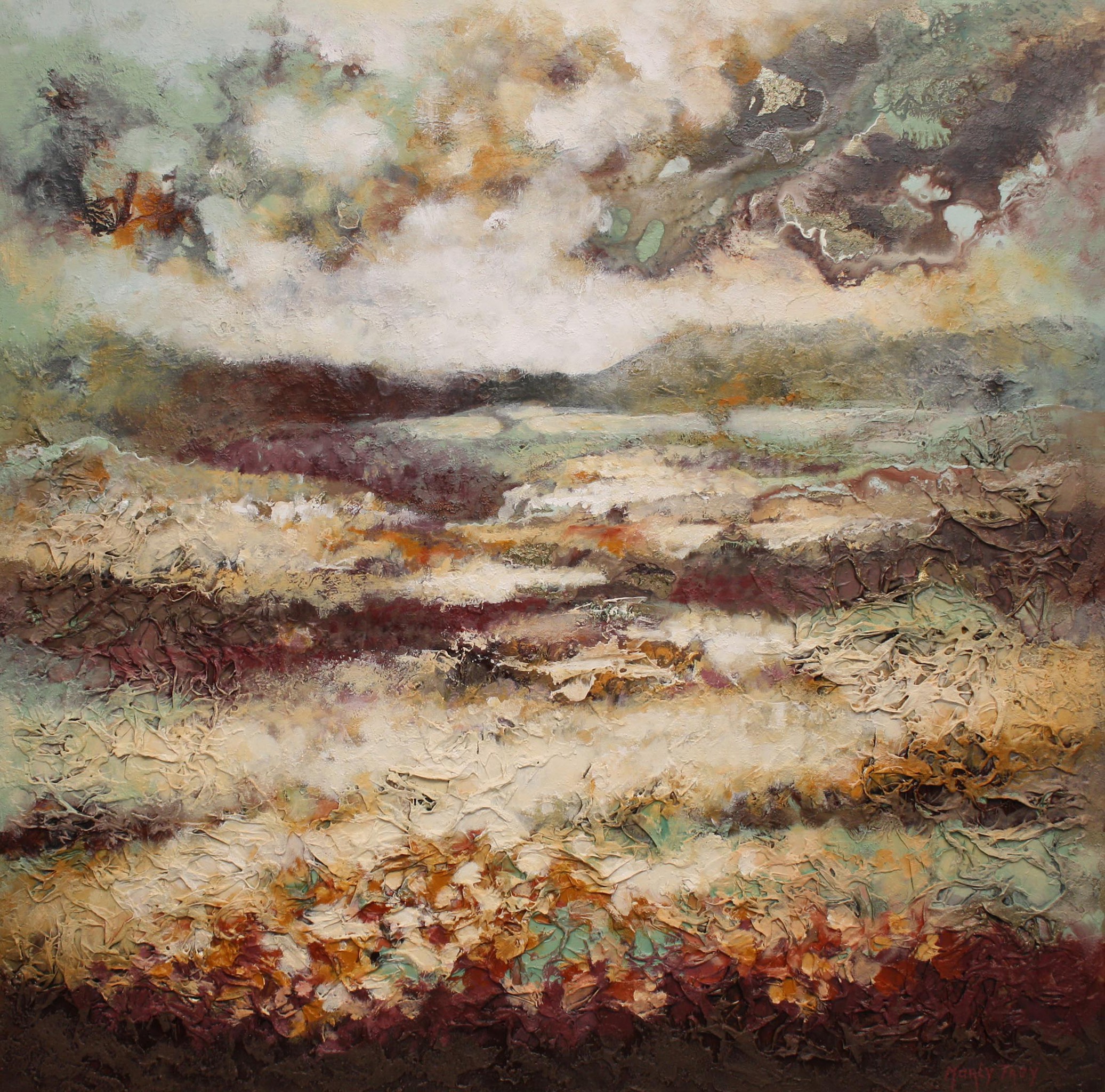 Marly Freij maakt grote kleurrijke, maar ook meer ingetogen schilderijen in gemengde techniek, met name sferische landschappen en abstracte composities