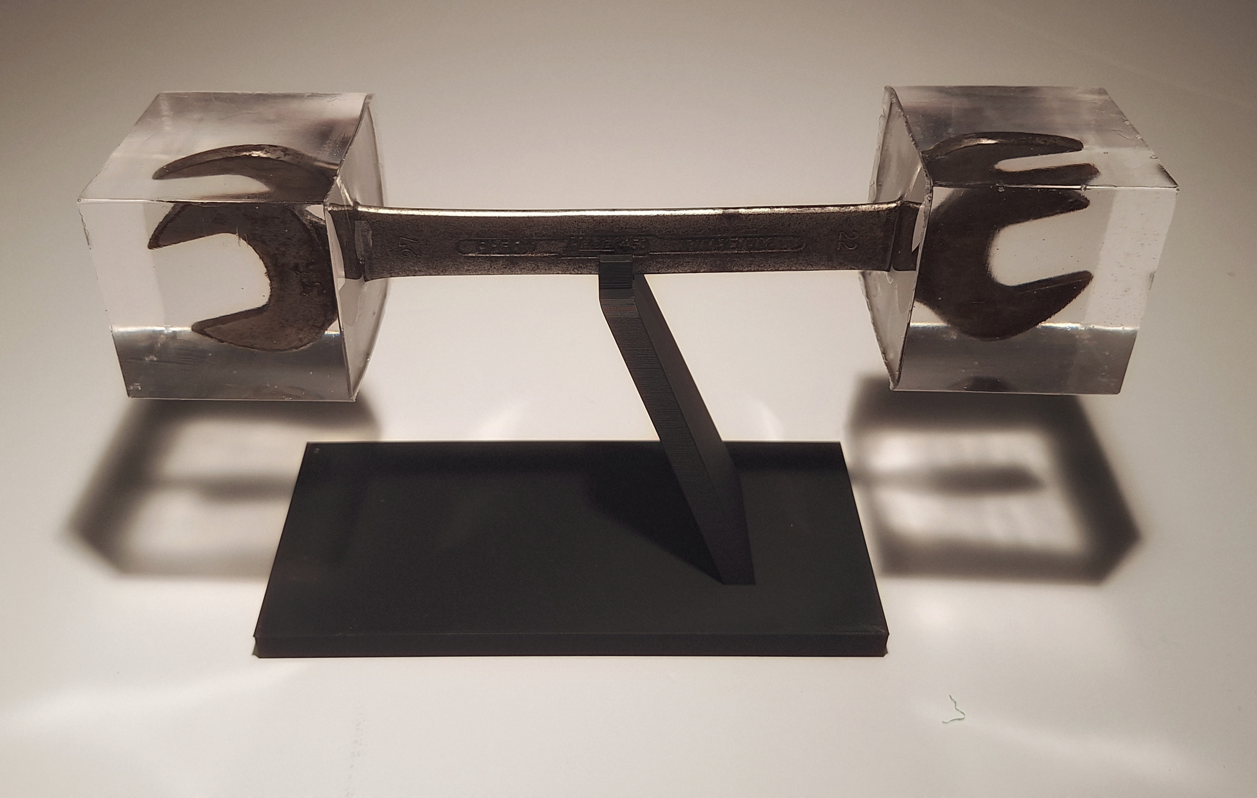 A steel wrench is fixed horizontally and supported at a single oblique point. Both functional ends are encapsulated in transparent epoxy blocks, rendering the tool permanently inoperable while preserving its form. The object is held in a state of balance that appears stable yet contingent, as if dependent on a minimal and potentially arbitrary condition. The work stages a contradiction between use and suspension. The wrench, an instrument of torque and intervention, is deprived of its capacity to act. Its ends are archived rather than erased: function persists as a visible but inaccessible possibility. The support does not simply carry the object; it defines the precise condition under which it can exist at all. Equilibrium here is not a neutral state but a constraint. What is presented is a system in which access is implied but structurally denied, and where causality appears evident while remaining unverified.