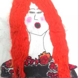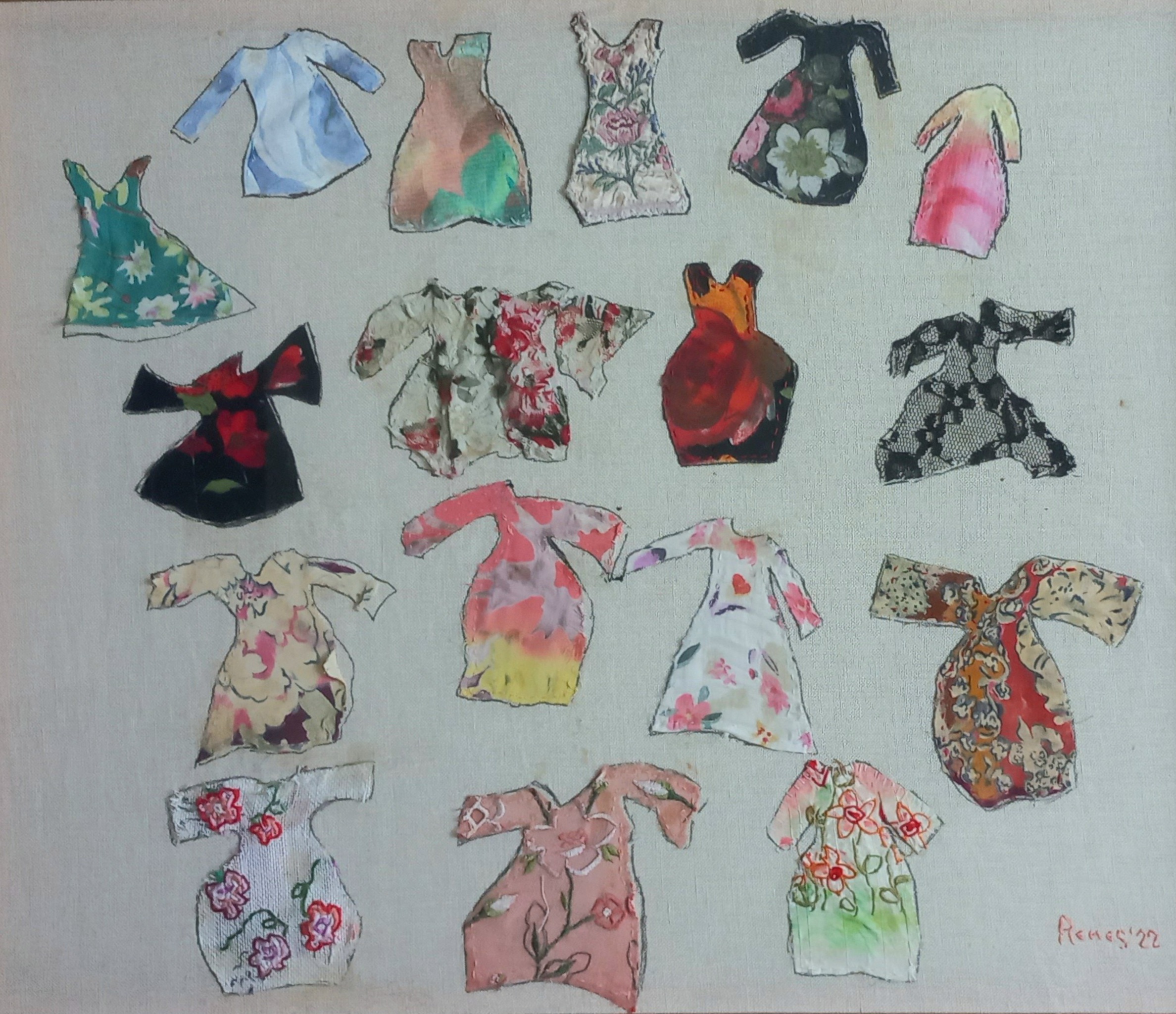 collage van jurkjes, geknipt uit verzamelde stoffen, in houten lijst