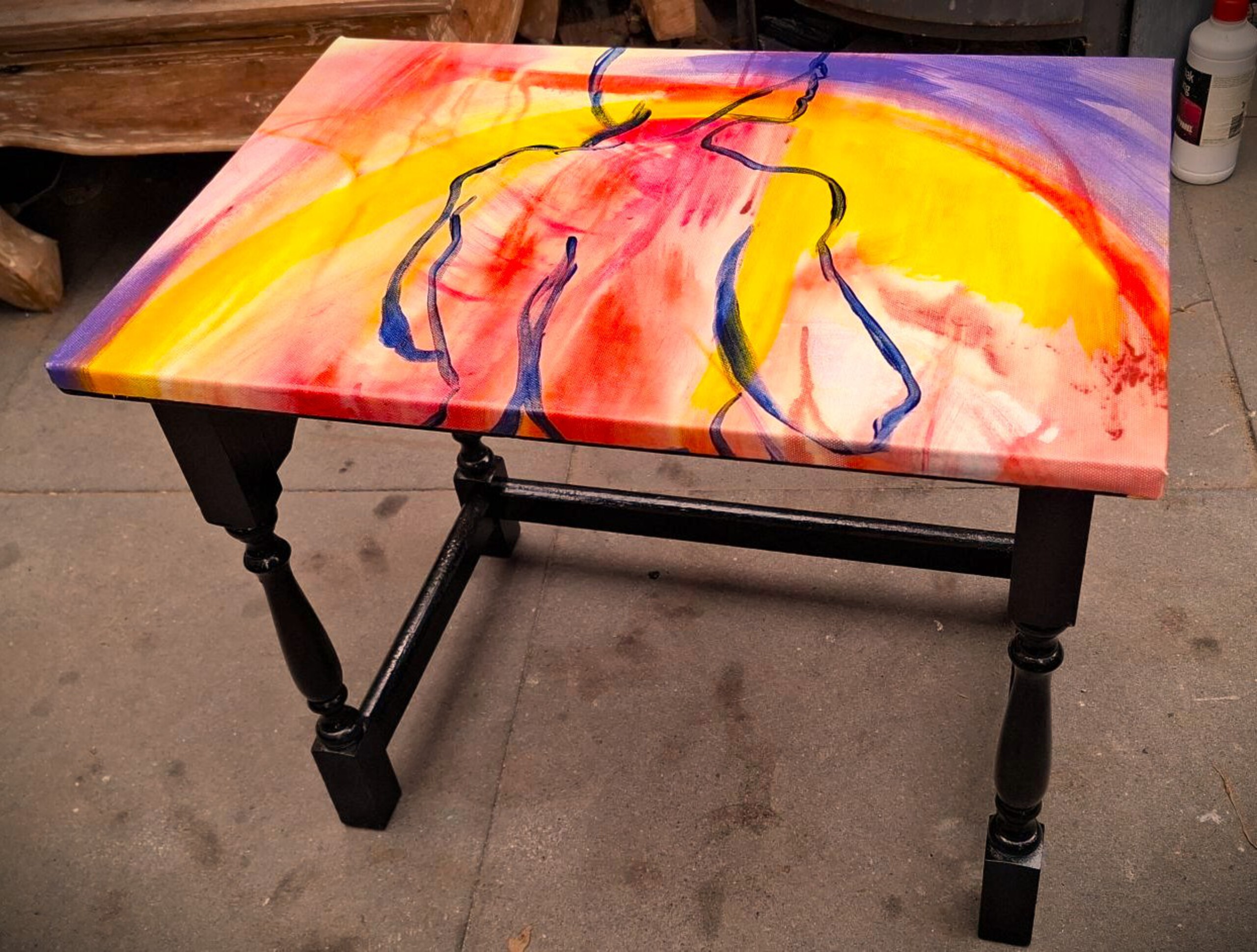 Dit tafeltje is een eyecatcher in uw huis. De stoere vrouw, is de ene helft van het schilderij , terwijl het billenkoek krukje de andere helft is.