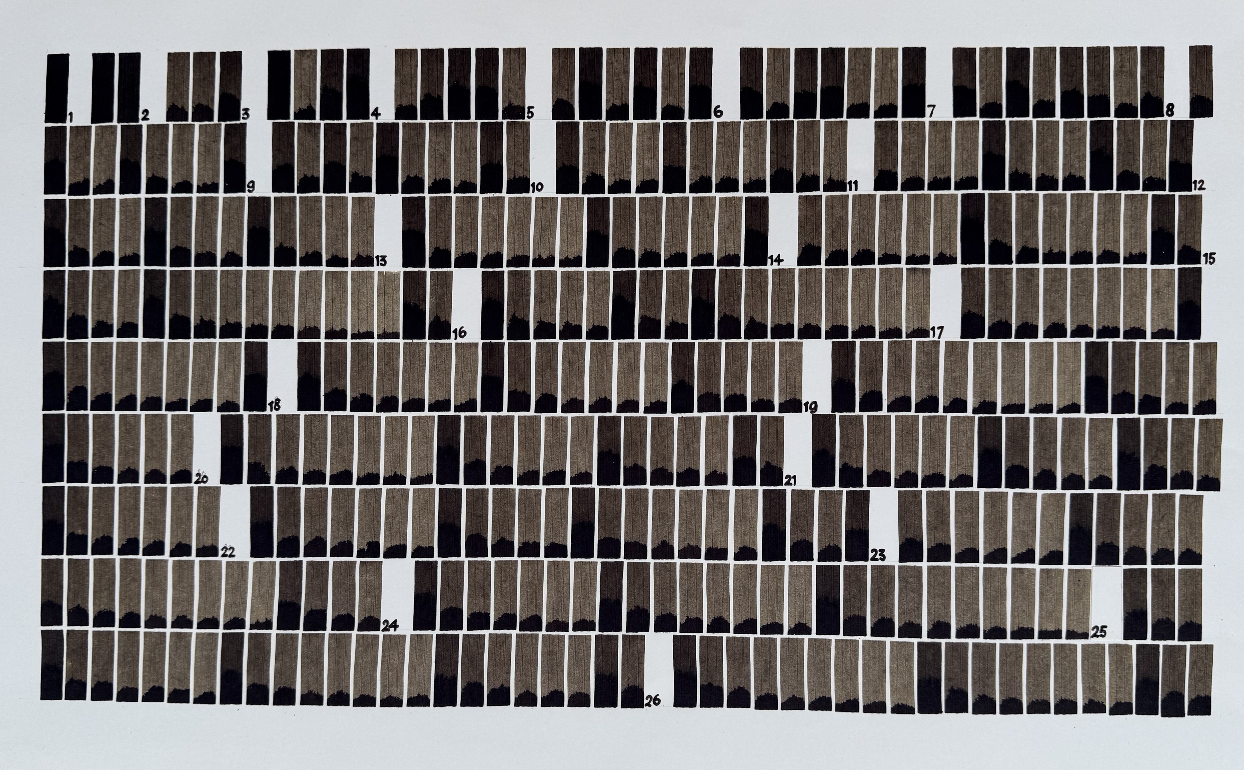 Vertikale halen met beitelpen en schrijfinkt in aantallen van 1 t/m 26.