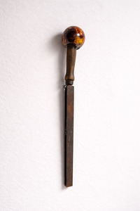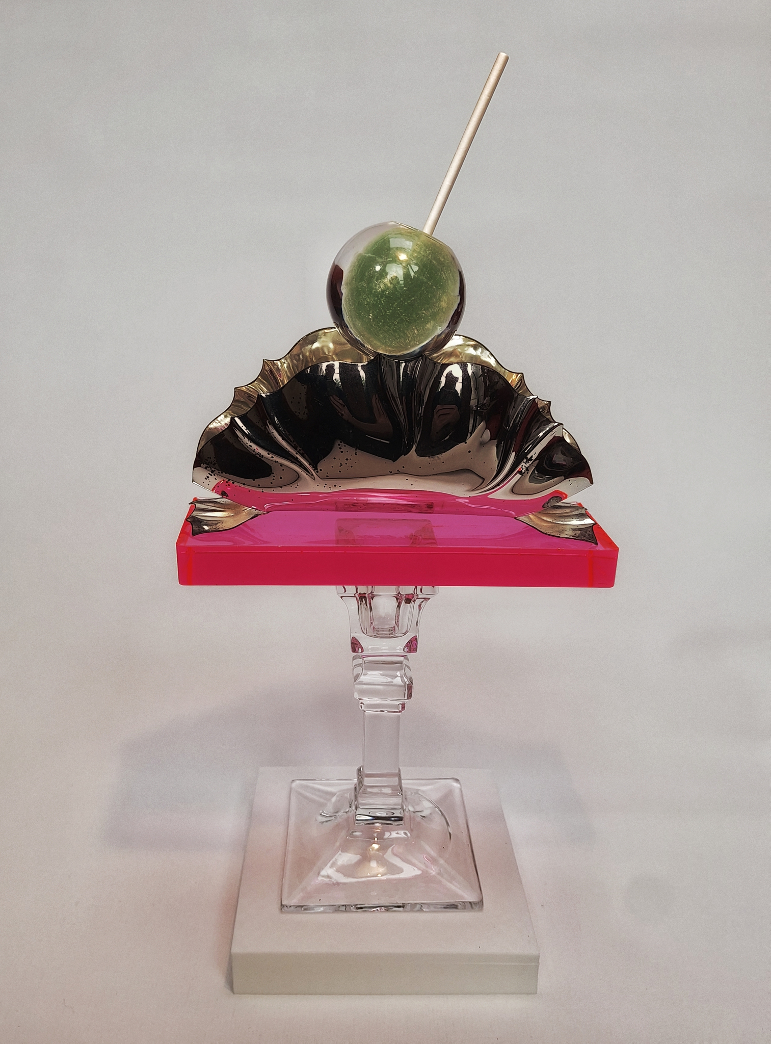 This work consists of a vertical assembly of found and fabricated elements: a lollipop encapsulated in transparent resin, placed on a faux-silver shell-shaped napkin holder, resting on a thin pink resin plane, supported by a glass candleholder, and mounted on a minimal white 3D-printed base. The sculpture loosely references The Birth of Venus, but replaces mythological emergence with an artificial appearance. The shell, traditionally a symbol of origin and nature, appears here as a decorative and industrial object. The sea is reduced to a thin layer of pink resin. What emerges is not a goddess, but a preserved lollipop: desire held in suspension. The work does not communicate a fixed meaning, but stages a condition of suspended appearance. In this sense, it resonates with Jean Baudrillard’s notion of the precession of signs: signs that no longer refer to reality, but precede and replace it. The lollipop is no longer an object of consumption, but a sign of desire that is itself fixed and exhibited. Materials associated with consumption, decoration, and display are stacked into a fragile equilibrium. The white base does not function as a classical pedestal, but as a minimal support that intensifies the vertical tension. Due to its reduced scale, it almost disappears as a display element, shifting attention to the precariously stacked forms above. “Vertical Assembly (After Venus)” explores how images continue to circulate after their original meaning has dissolved. What remains is an assembly of forms, materials, and references—an appearance without origin, an echo of an image that once seemed self-evident.