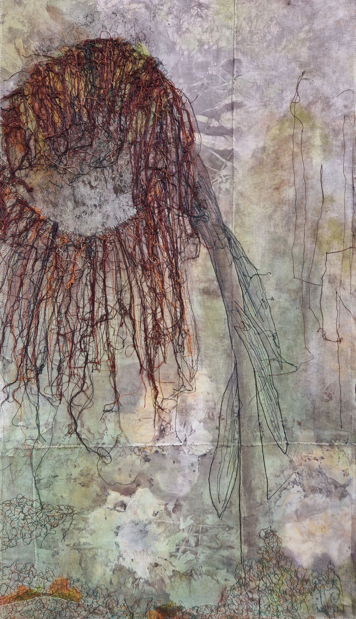 Machinaal borduurwerk op een met verf en eco-dying bewerkte ondergrond lap.
