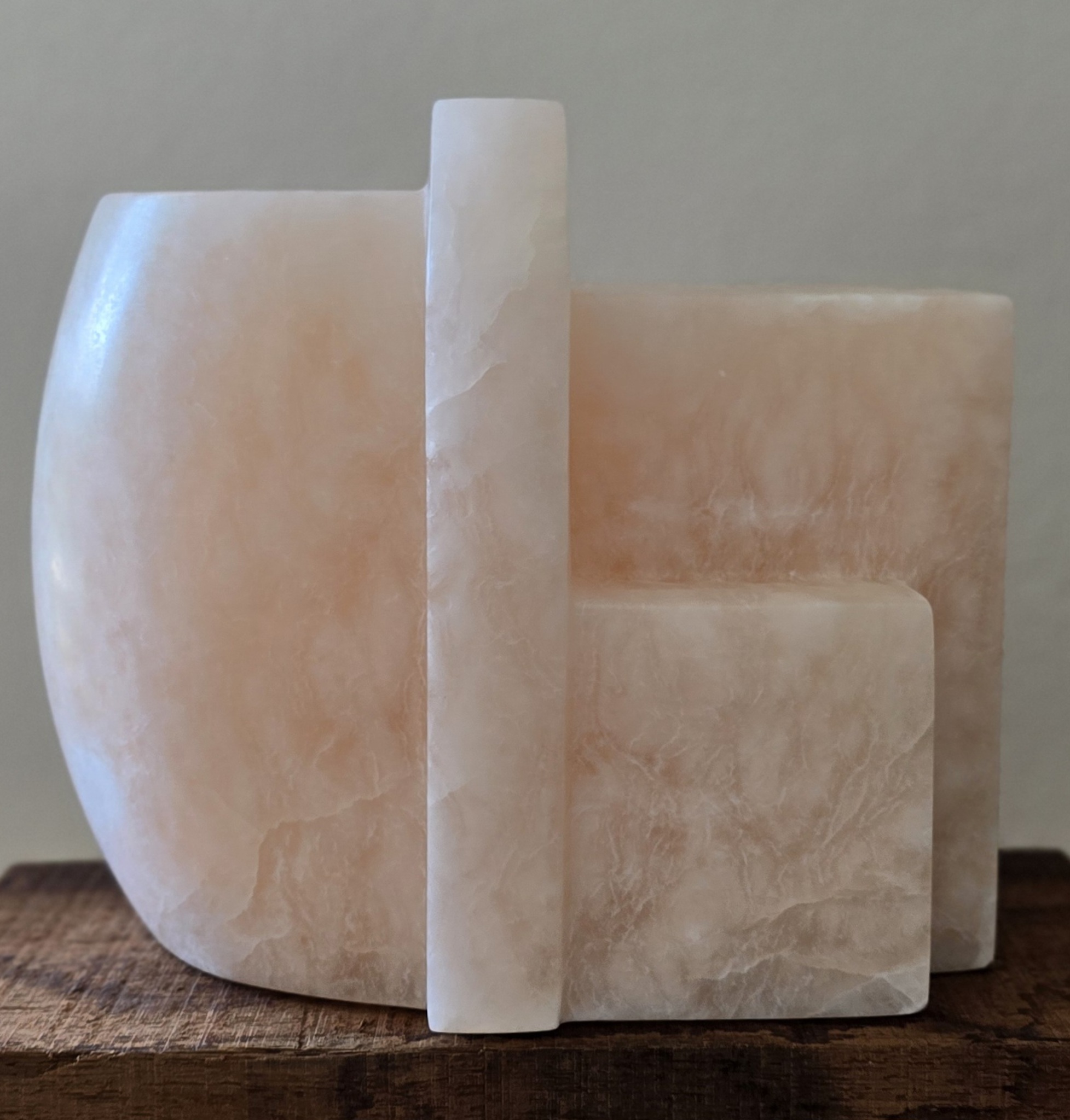 Roze albast (zalmkleurig). Alleen geschikt voor binnen. Inclusief hardhouten sokkel.