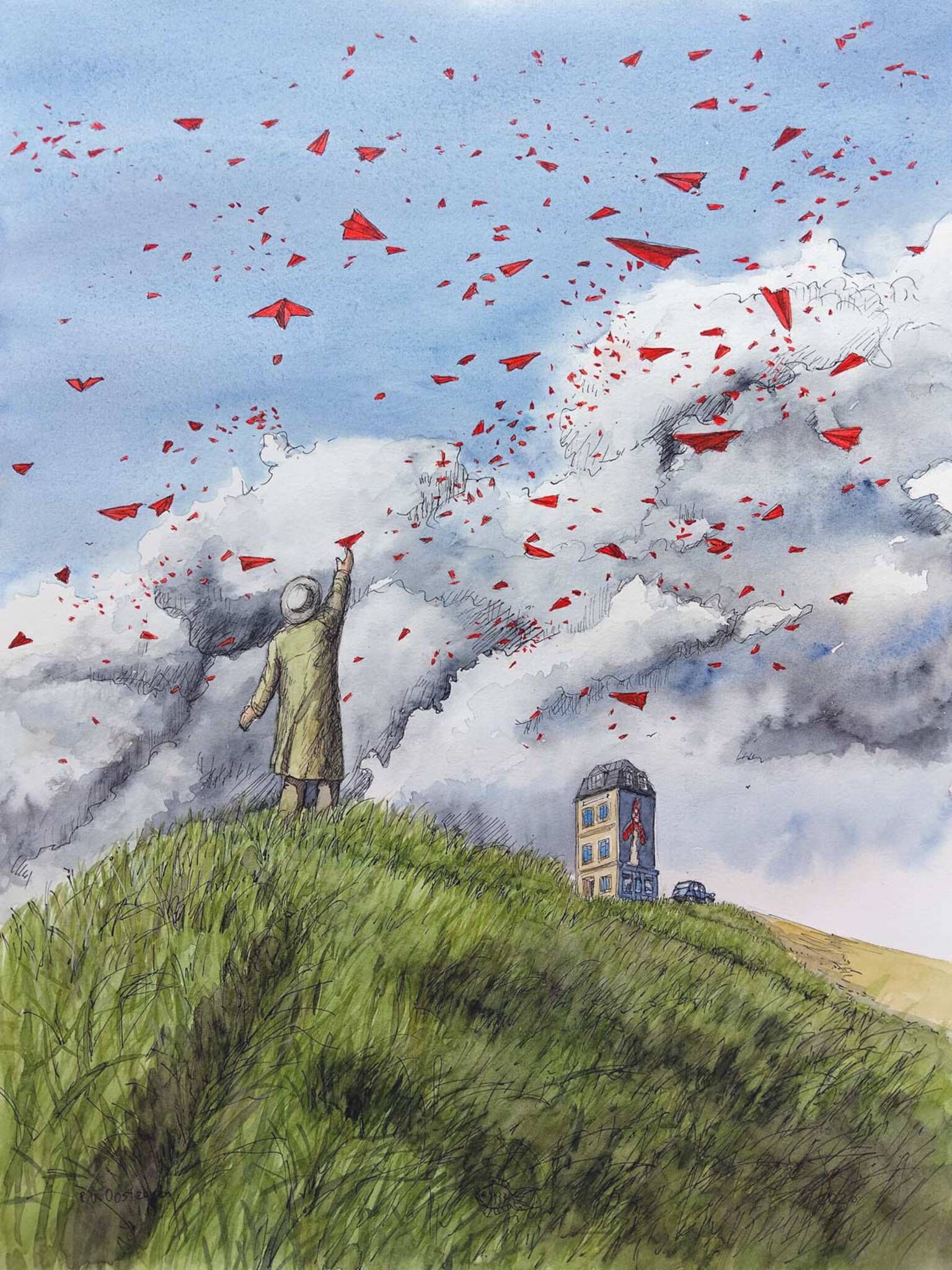 Vanaf een strandduin laat een gehoede man honderden rode papieren vliegtuigjes los in een bewolkte lucht. In de verte staan een smal hotel en een geparkeerde auto, die het landschap een dromerige schaal geven. De aquarel vangt een speels en surreëel moment van loslaten en vrijheid.