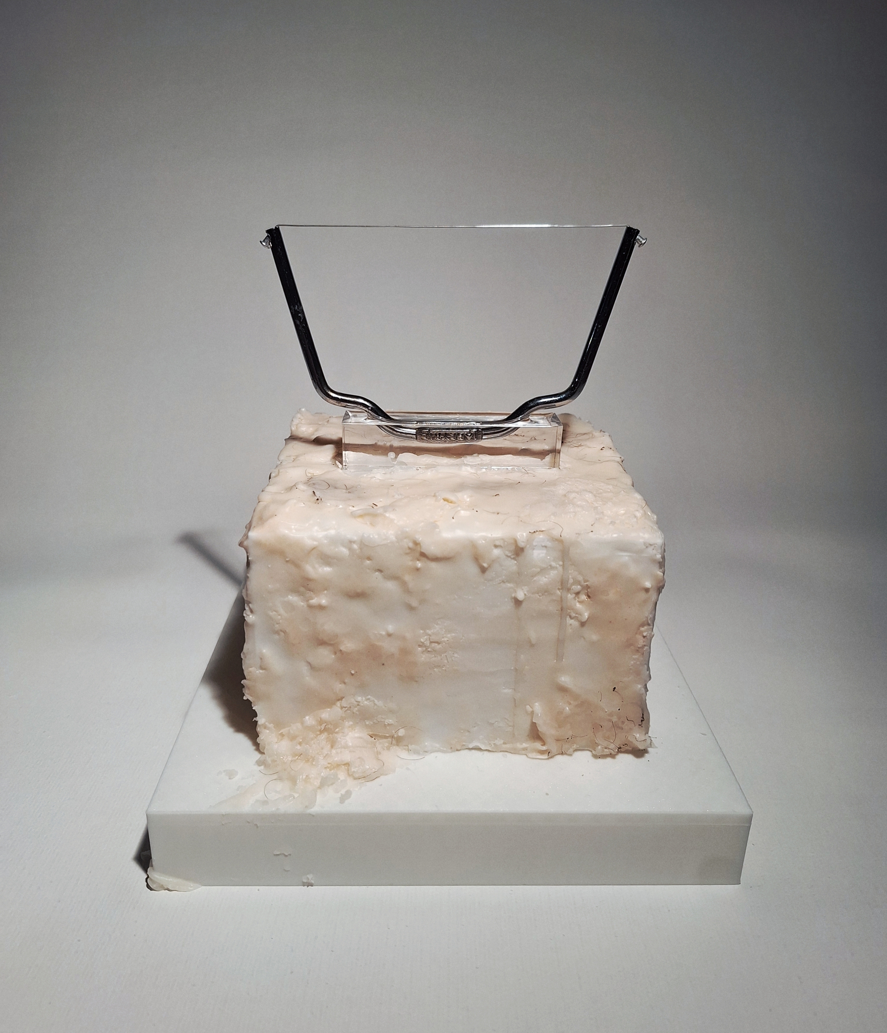 A domestic tool is immobilized: the handle of a cheese slicer is cast in epoxy and partially sunk into a wax-covered cube. The cube—3D printed and coated with paraffin mixed with human hair and oil paint—hovers between object and body, between food and residue. Its surface suggests fat, skin, and decay, yet remains structurally geometric, resisting full identification. The slicer implies an action—cutting, portioning, consumption—but that action is suspended. No slice is visible. No causal chain can be confirmed. The tool is present, yet functionally absent. The epoxy acts as both preservation and obstruction: a transparent barrier that fixes the object while preventing its use. Wax drips extend from the cube onto the plinth, collapsing the distinction between object and support. These flows suggest time, heat, and transformation, but without a clear origin. Did the cube melt? Did something external intervene? The work offers traces of an event without allowing its reconstruction. The piece operates in a space of false causality: it presents all the signs of an action while withholding its occurrence. In this sense, it aligns with a logic where effects appear to precede or exist without causes. The body—implied but never fully present—“remembers” through material residues, yet what it remembers cannot be verified.