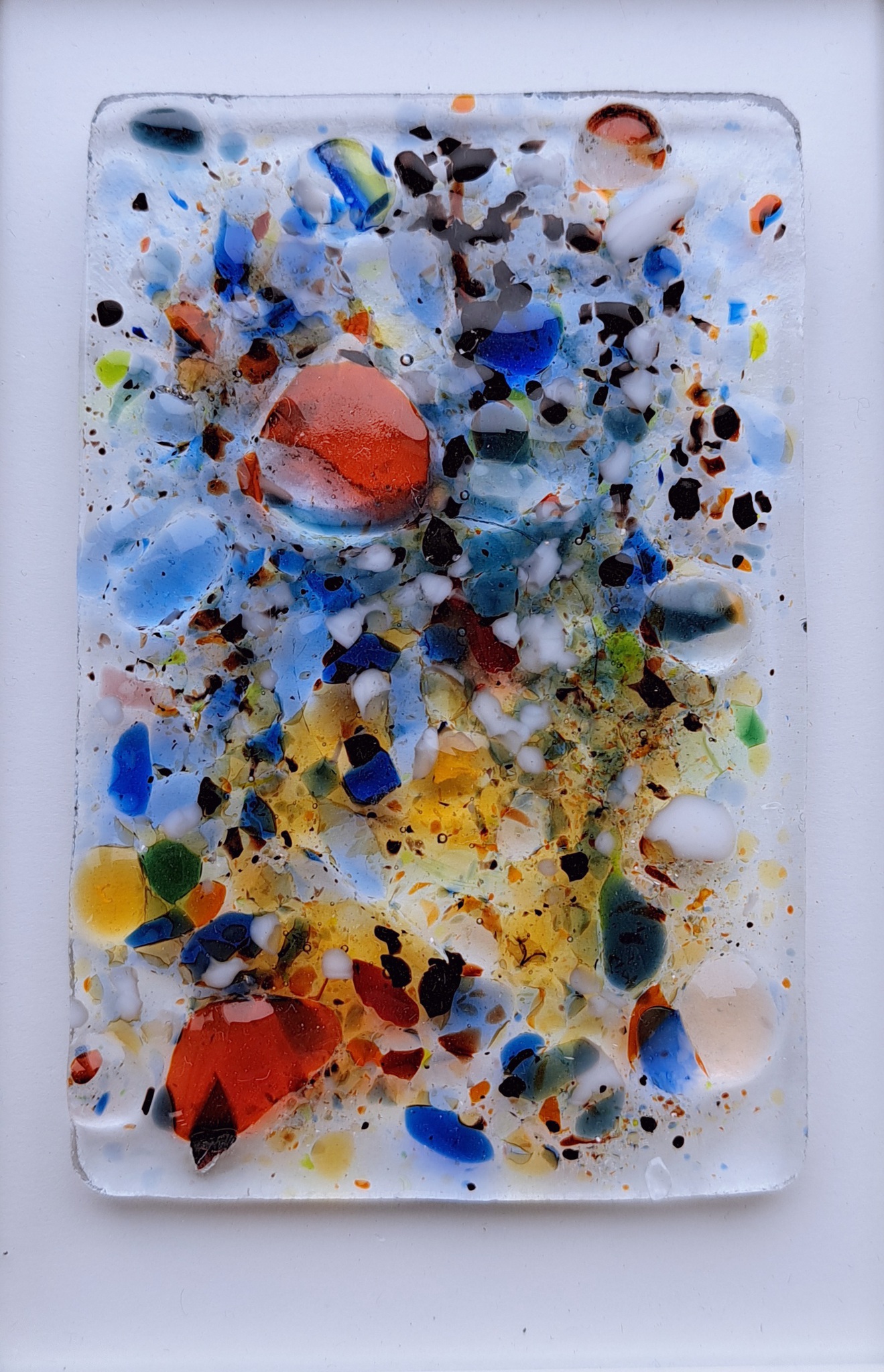 Dit glasobjectje is ingelijst in een wit lijstje. De afmetingen van het glaswerkje zijn 7 x 11 cm.
