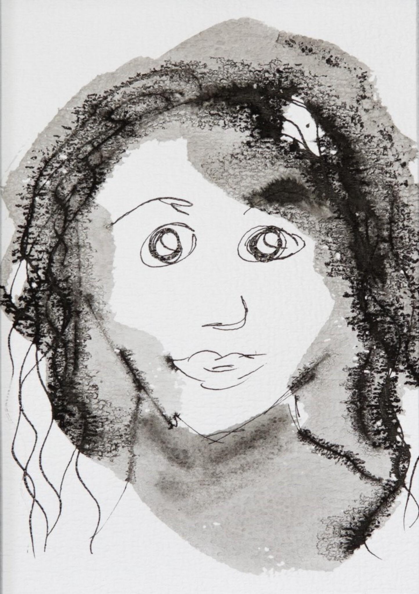 Fictief portret gemaakt met zwarte inkt. Deze portretten zijn als doodlen als ik ze maak. Beginnen en zien wat het doet. Inkt laat zich niet sturen en zo ontstaat er elke keer weer een ander gezicht.